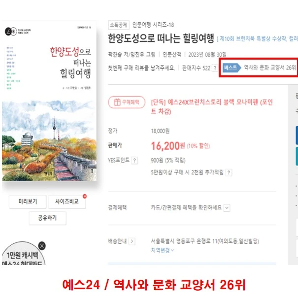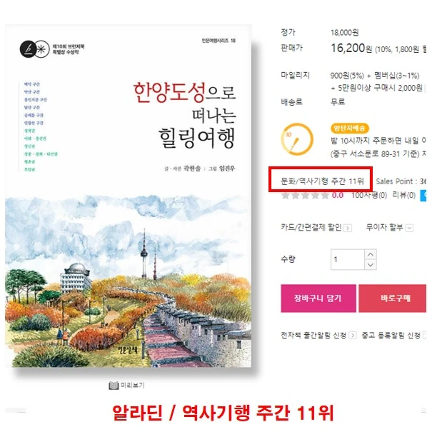 특히 예스24와 알라딘은 분야가 굉장히 세분화되어 있다. 심지어 역사 분야 안에서도 10가지가량이나 된다. 그런 상황에서 일시적으로, 연락한 지인들이 집중 구매를 며칠 사이 해준 결과 주간 순위가 올라갔다. 예스24는 26위(최고 24위), 알라딘은 무려 11위(최고 8위). 마치 리얼 베스트셀러가 된 것 같은 착각을 일으키게 되더라. 아름다운 순위이지 않은가!?