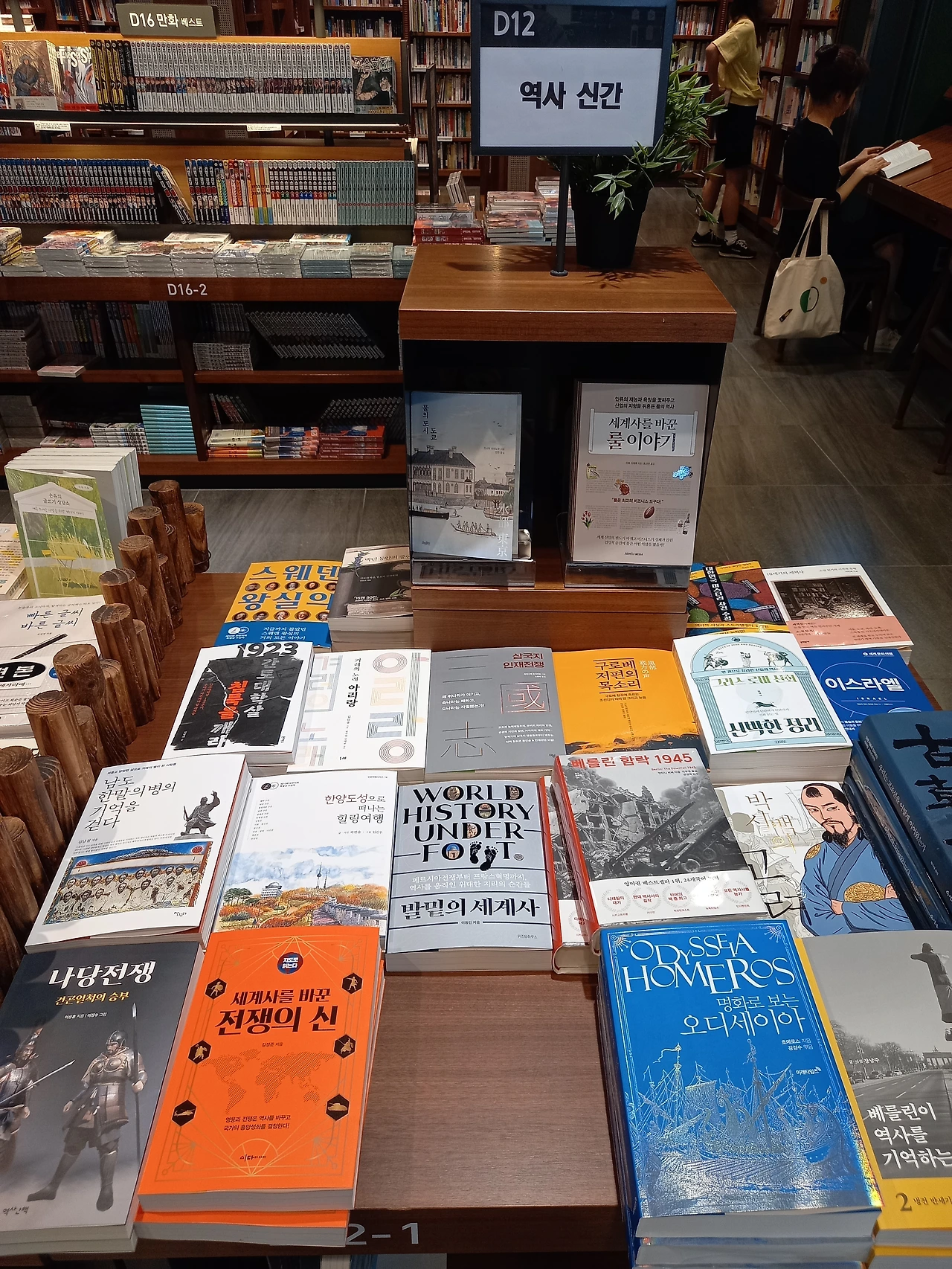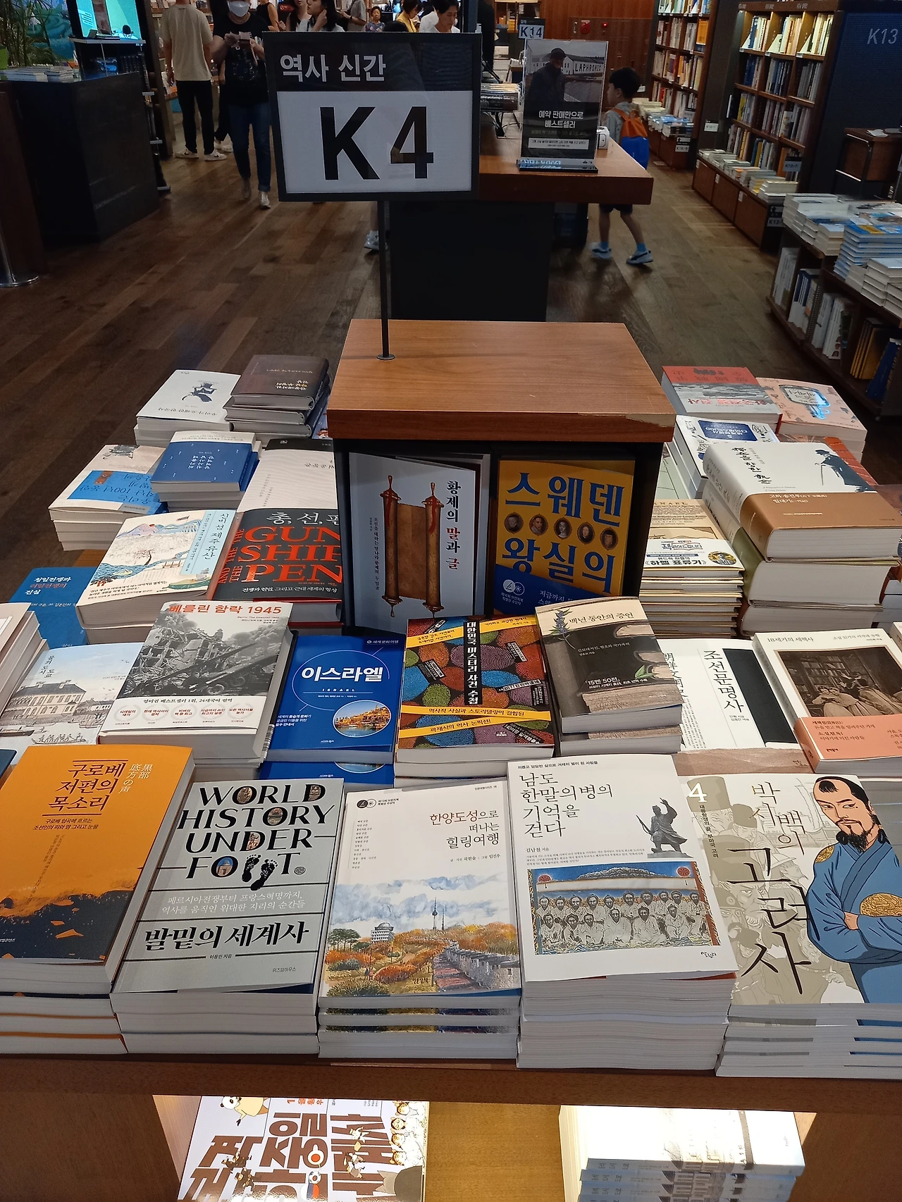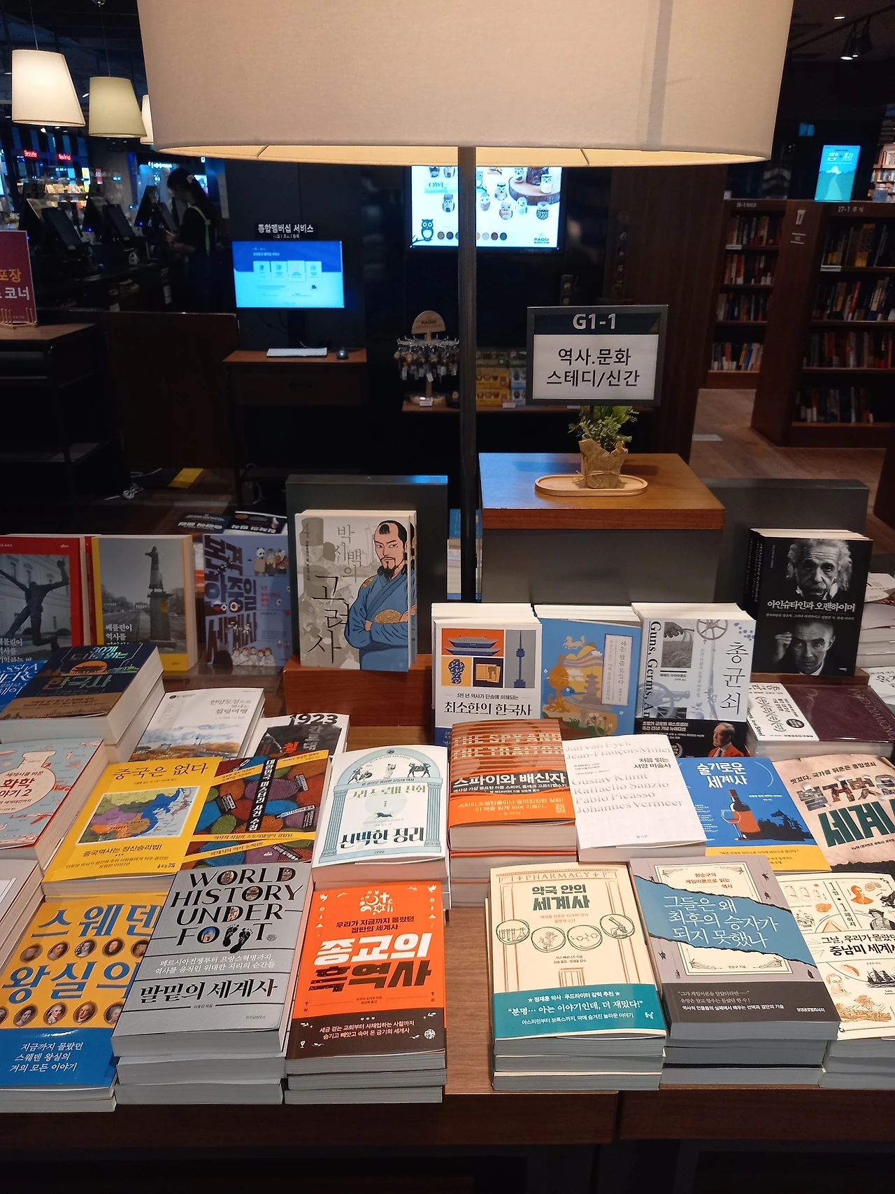 광화문 교보문고에 내 책이 있다니! 감격스럽지 않을 수가 없었다. 바로 인증숏을 찍었다. 역시나 역사 도서들은 책이 크고 두꺼웠다. 바로 왼쪽의 '발밑의 세계사'와 옆 쪽의 '박시백의 고려사'. 참고로 이들 도서는 다음 매장, 다 다음 매장과 또 그다음 매장에서도 계속 내 책과 함께 보여서 이제는 너무 친숙하다. 또한 영광이었다.