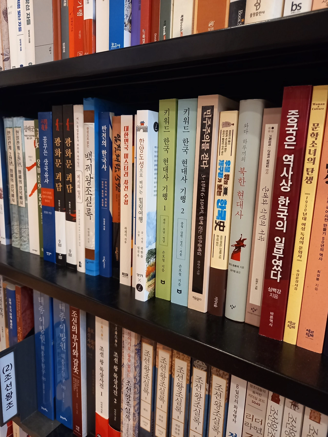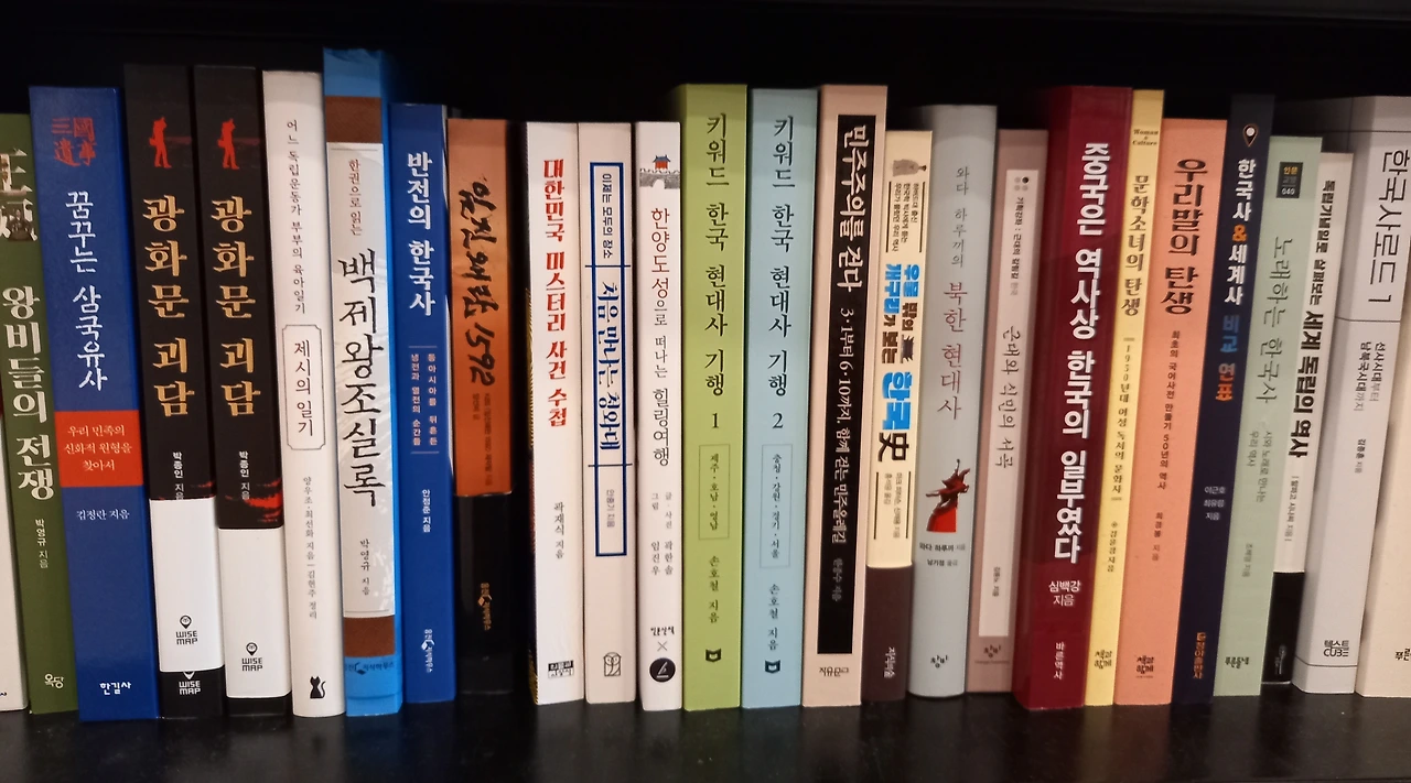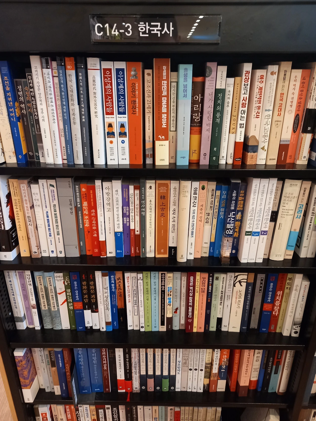 다른 지점은 '역사 신간'코너에 위치해서 찾기 쉬웠다. 그런데 여기는 찾기 어려워 기념의 목적 외 찾기 위한 목적으로도 도서검색대를 활용한 결과, '14-3 한국사' 코너에 있단다. 드디어 책장 앞에 이르렀다. 못 찾겠더라. 새로로 5칸, 1칸 당 약 30개의 도서가 빼곡히 있었다. 같은 디자인의 시리즈 책들은 눈에 띄었는데, 단 권의 책이자 가뜩이나 덩치도 작아 쉽게 차지 못했다. 위에서부터 한 권 한 권 손으로 가리켜 가며 찾기 시작했다.