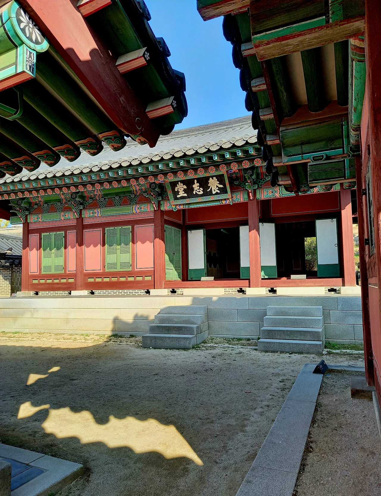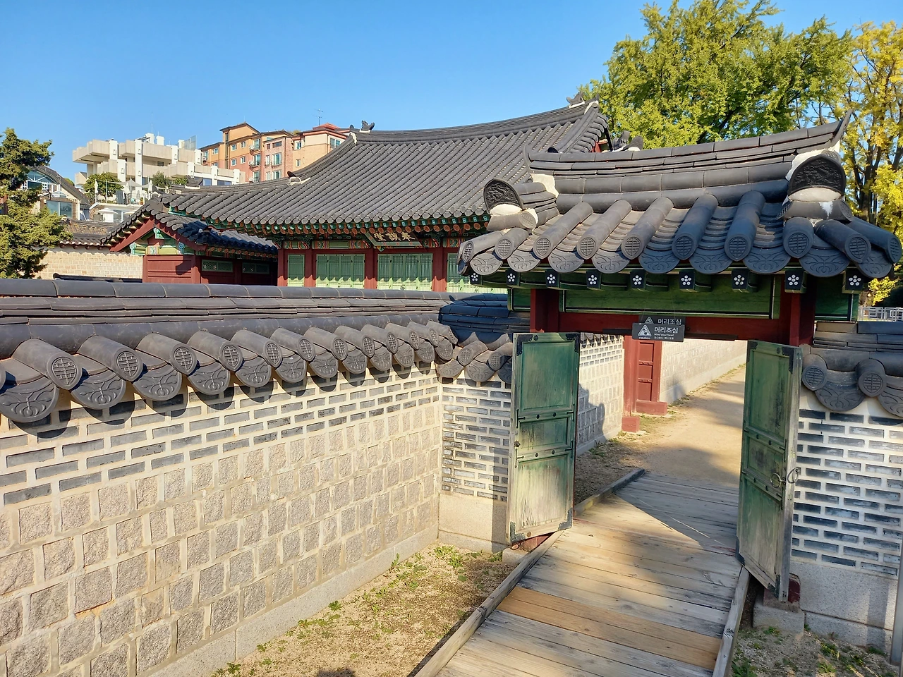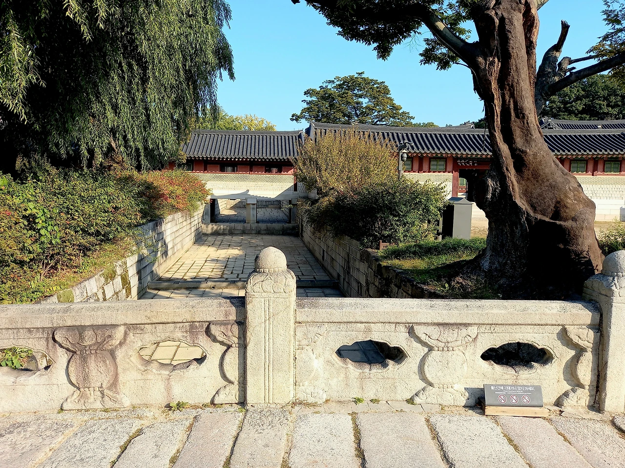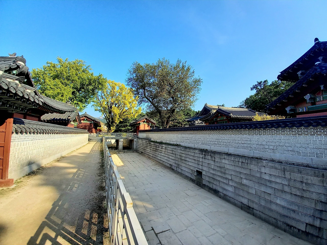 지난 궁궐들을 탐방하면서 확실히 인지하고 있는 것이 있다. 정전 옆에는 왕의 사무공간인 편전이 있다는 사실. 인정전 동쪽 옆 전각은 예상대로 편전이 있었고 그 이름은 선정전이다. 청기와를 올린 것이 색다른데 청기와는 가격이 비싸 귀하다고 여겨지며 궁궐 내에서도 흔히 볼 수 없다. 사실 복도각으로 인해 선정전 청기와를 잘 못 봤는데 오히려 원거리에서는 잘 보였다.