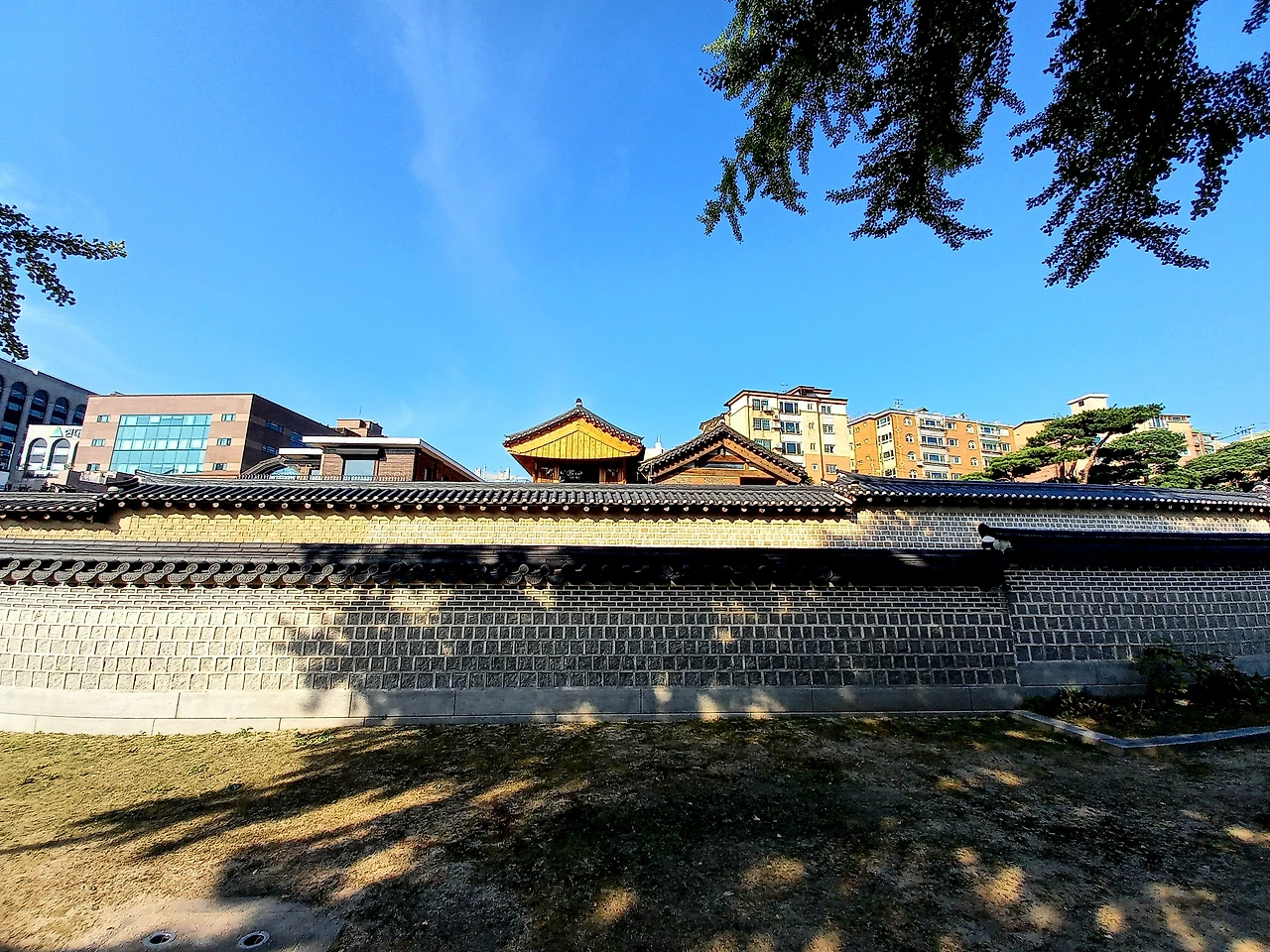 가운데 한옥 지붕과 왼편의 주택 및 빌딩, 오른편 너머의 아파트 혹은 빌라가 줄지어 있는 모습. 담장 너머로 각기 다른 유형의 건물들이 조화를 이루는 광경이 개인적으로 무척 마음에 들었다. 다음 전각을 보기 위해 책고 근처에서 다리를 건너는데, 그 풍경이 장관이었다.