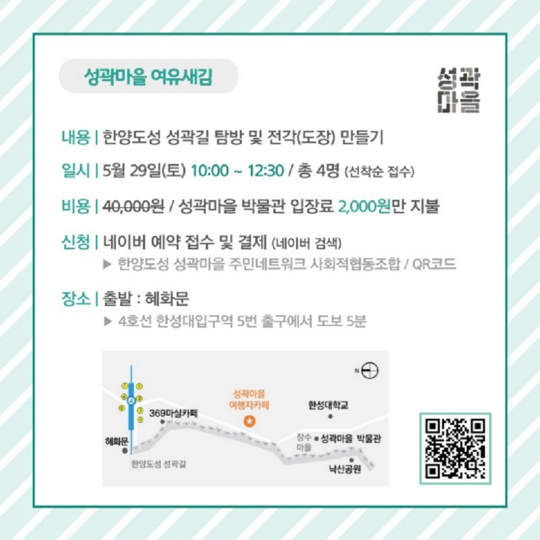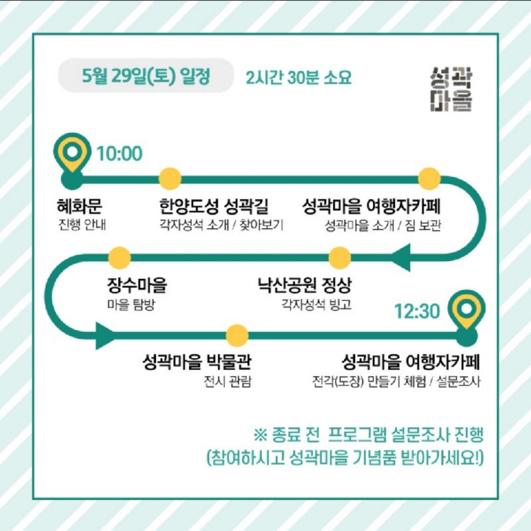 (혜화문 ~ 한양도성 성곽길 ~ 낙산공원 ~ 장수마을 ~ 성곽마을 박물관 ~ 성곽마을 여행자카페 ~ 전각 만들기 체험)