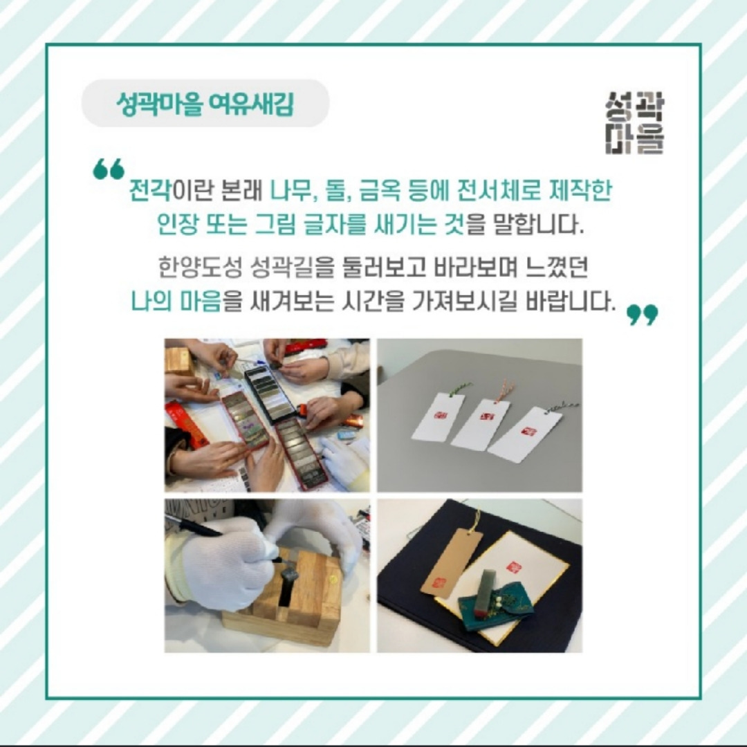 - 한양도성 성곽길 걸으며 아름다운 경관 감상하고, 성곽마을 구경, 성곽마을 박물관 전시 관람에 전각 만들기 체험까지. 종합 선물세트를 받다!