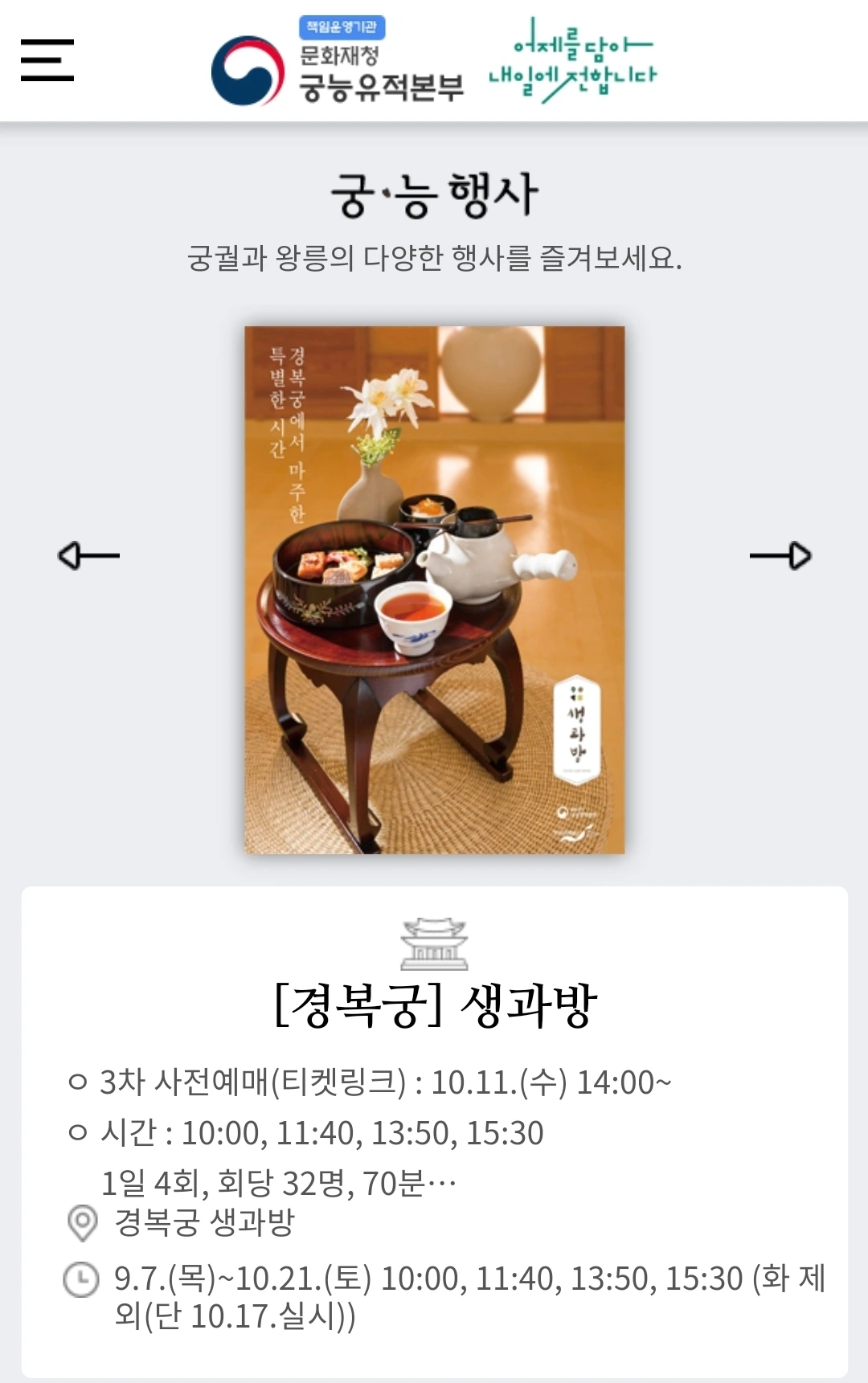 나중에 찾아보니 생과방 체험행사를 예약(유료) 하면 이 안에서 임금이 먹었던 궁중병과와 궁중약차를 먹을 수 있더라.