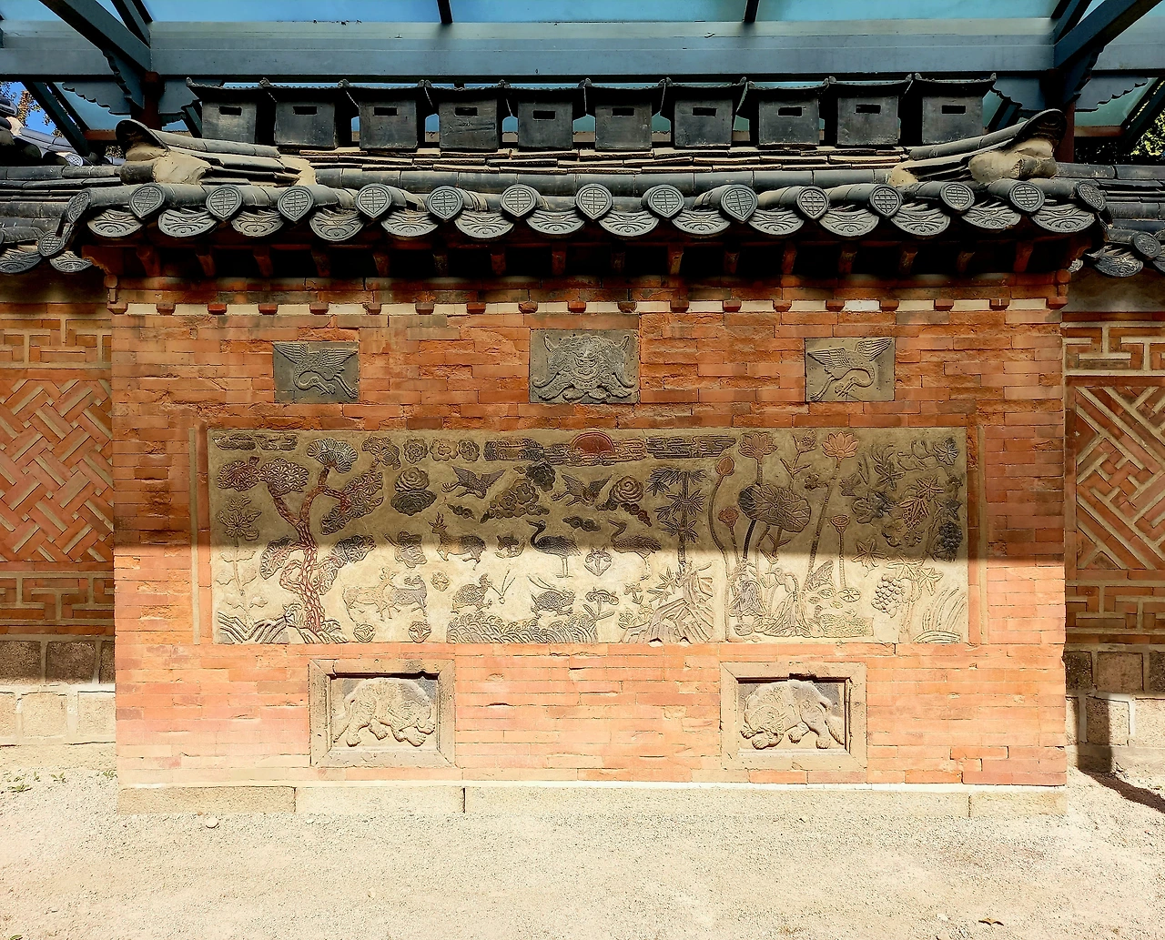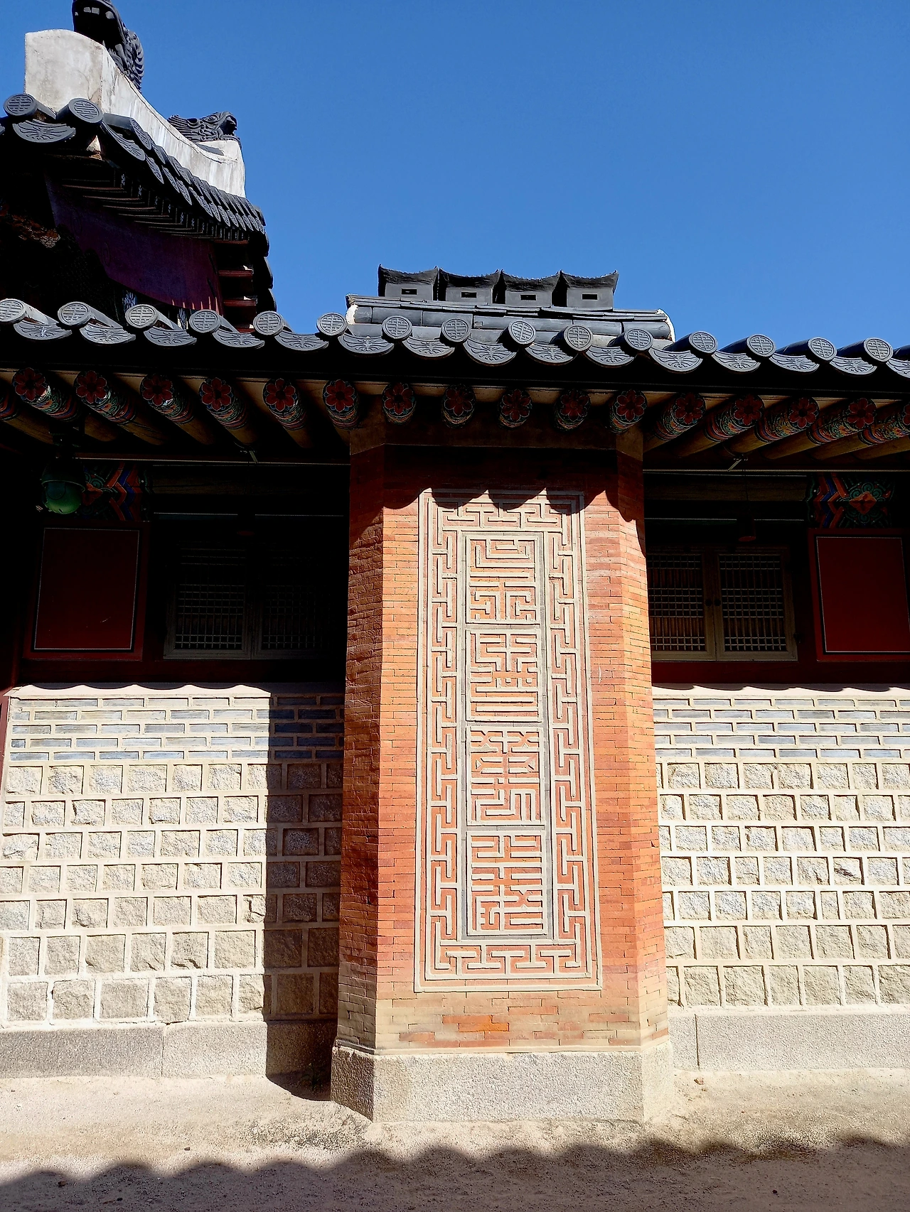 책을 안 읽고 갔으면 굴뚝인 줄 모르고 그저 기둥이며 가운데는 그저 예쁜 문양이구나 정도로 생각했을 것이다. 그러나 알고 가니 굴뚝이라는 것과 가운데 문양이 한자라는 건이 보이고 읽히더라. 서쪽은 '만수무강', 동쪽은 '천세만세'로 왕실의 번영과 건강을 기원하는 길상문이다. 처마 밑 꽃문양도 예쁘더라. 왕비와 왕의 침실로 들어가는 입구 다뤘다.