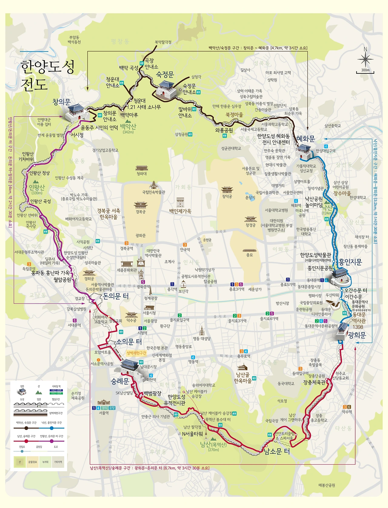 순성 순서 : 인왕산 구간 ~ 숭례문 구간 ~ 남산 구간 ~ 흥인지문 구간 ~ 낙산 구간 ~ 백악 구간