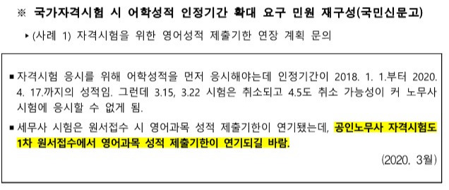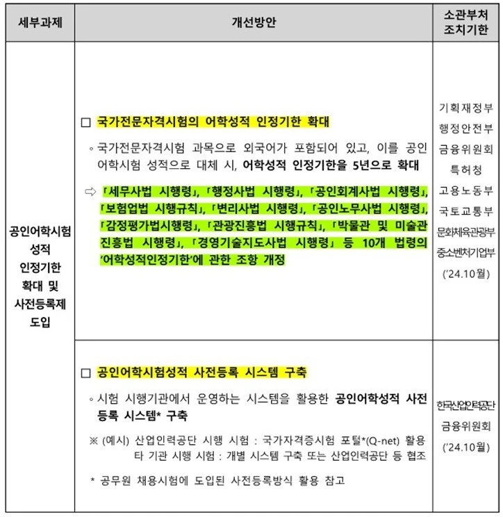 응시생들의 목소리가 받아들여져, 국가전문자격시험 과목으로 외국어가 포함되어 있고 이를 공인 어학성적으로 대체할 경우에 어학성적 인정기간을 5년으로 확대한다는 방안이 나온 것이다. 참고로 176개 국가전문자격 중 어학 능력을 기본소양으로 인정하여 시험과목 중 영어시험을 시행하는 자격은 총 25개로 확인된다고 한다.