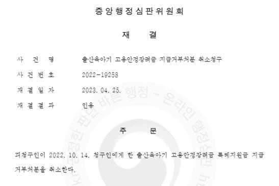 행정심판위원회에서는 “종합적으로 고려한 결과 피청구인이 육아휴직을 3개월 이상 연속하여 허용한 경우가 아니어서 이 사건 특례지원금 지급 요건에 해당하지 않는다는 이유로 청구인에게 한 이 사건 처분은 위법・부당하다”라고 결론 내렸으며, 청구인 사업주의 청구를 받아들였다.