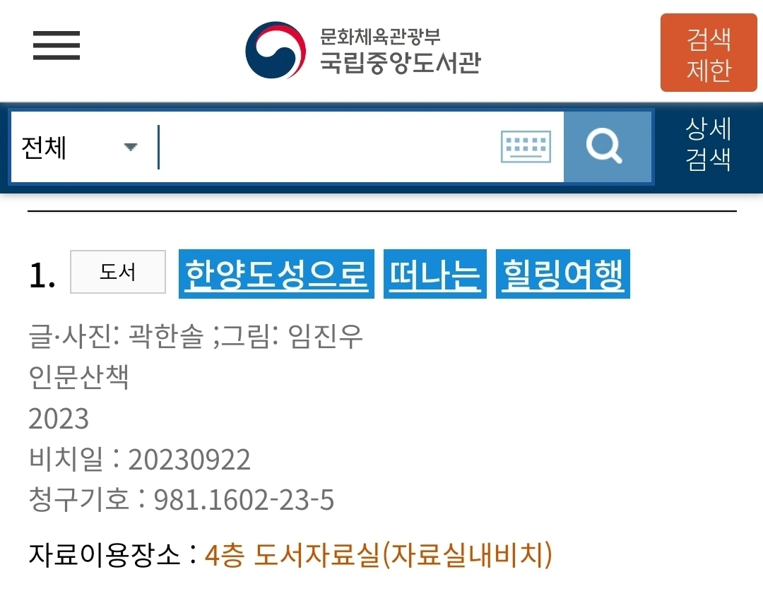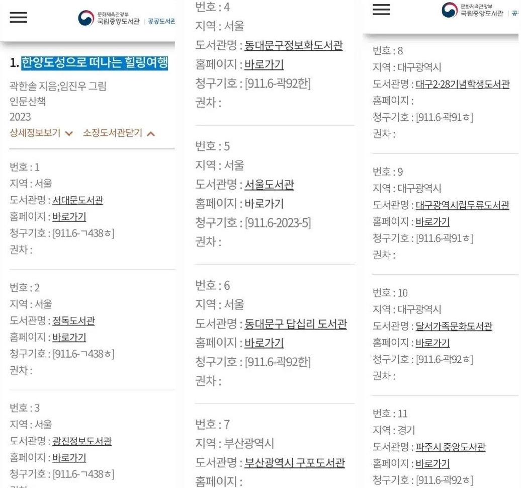 그리고 극히 일부지만 도서관에도 책이 들어온 곳이 있었다.먼저 국립중앙도서관과 국회도서관에 책이 있음을 홈페이지 검색을 통해 확인할 수 있었다. 또 구 서울시청 청사 자리의 서울도서관에도 책 발간 이후 초기에 진열됐다.