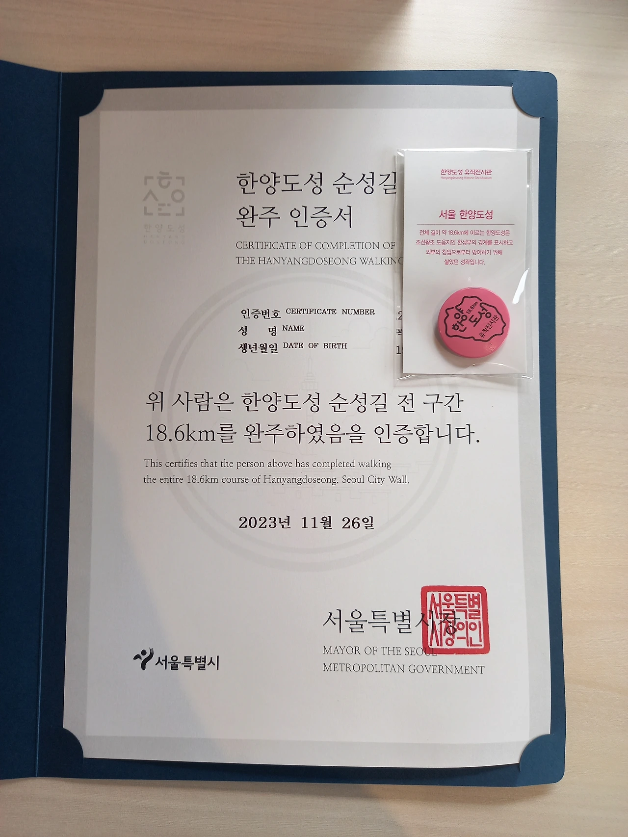 근래에 스탬프 투어 관련하여 분기별 한양도성 순성시 각기 다른 배지를 받을 수 있고 이를 모두 모으면 메탈 배지를 주는 제도가 새로 생겼다. 이번에 4분기 한양도성 순성을 마쳤는데, 내년 1~3분기에도 분기별 한 번씩은 공식적인 전 구간 순성을 해 메탈 배지를 받아보려 한다.