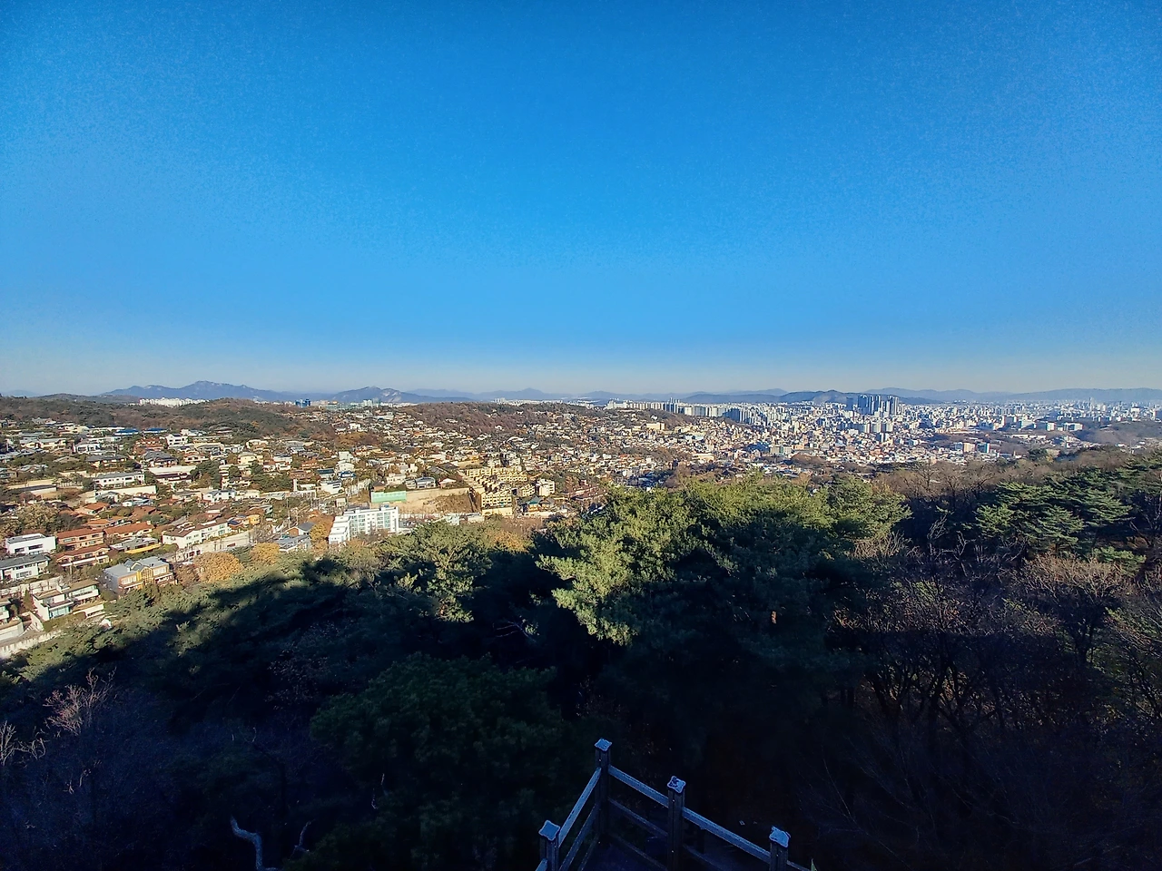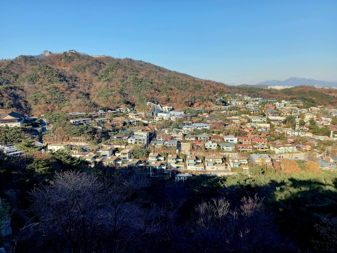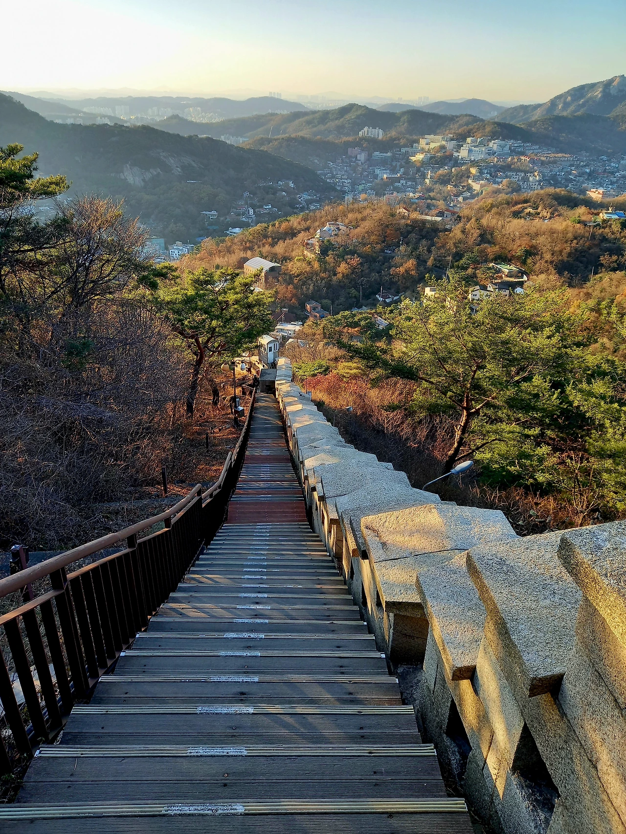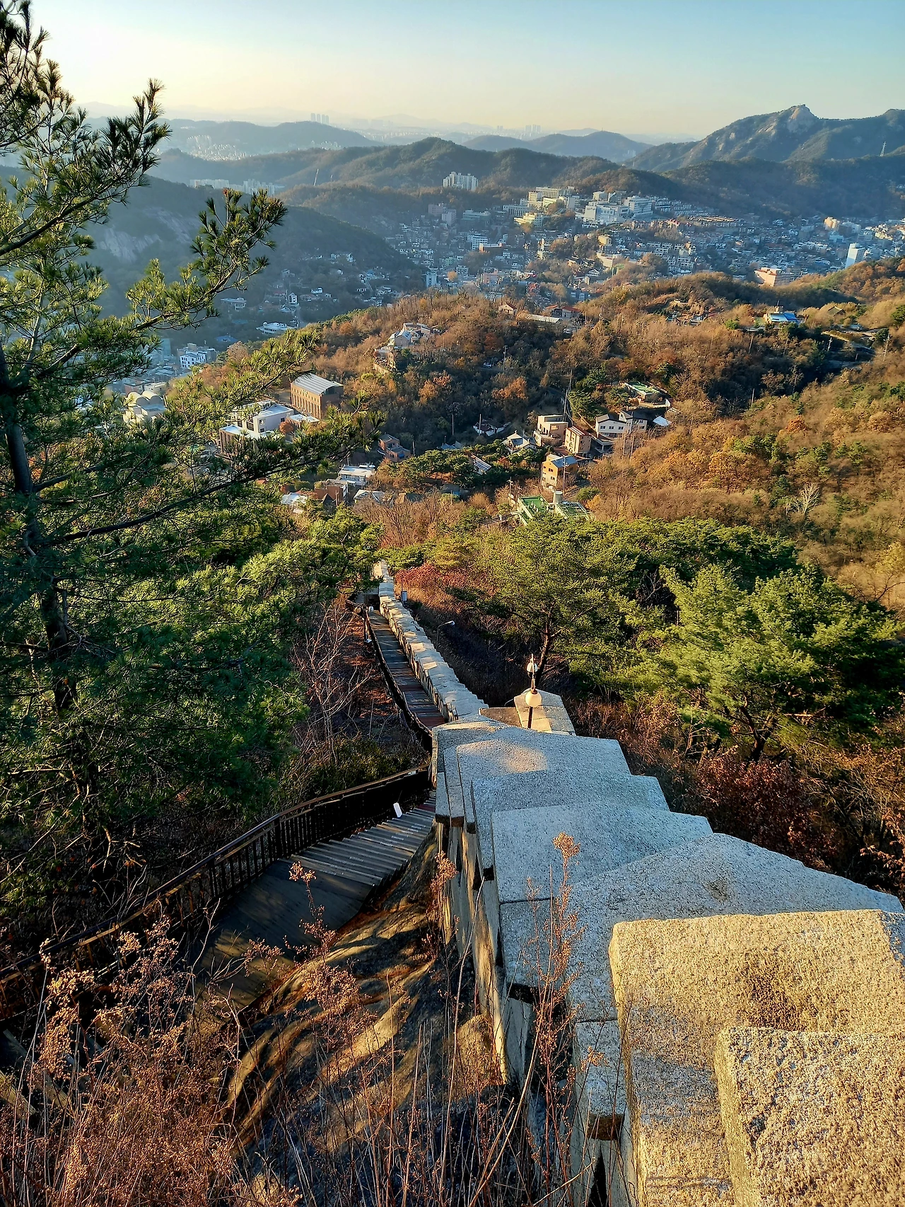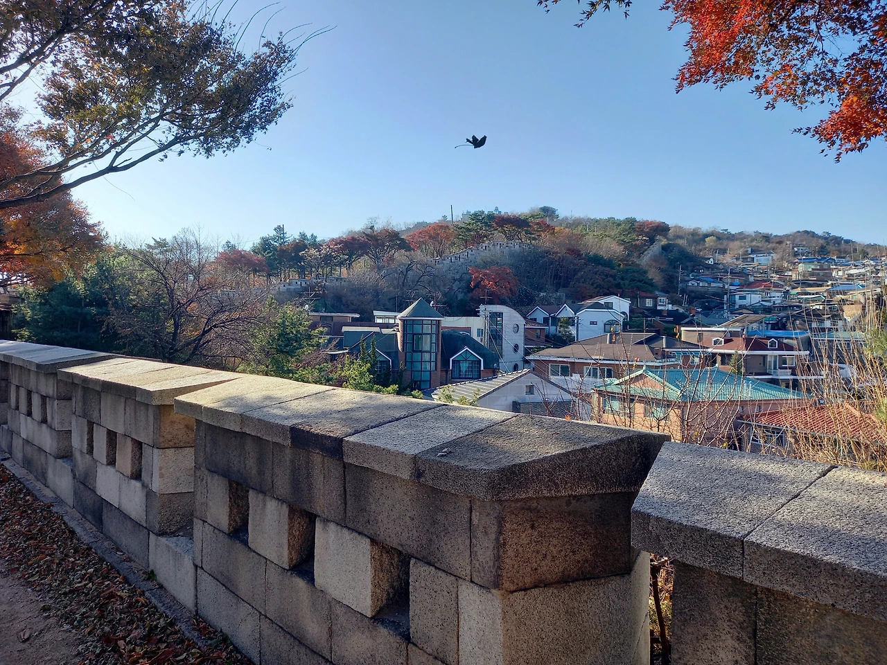 오르막길이긴 하지만 길이 잘 정비되어서 오를만한 길이다. 길게 북악산 방면으로 이어진 성벽과 그 아래의 마을 전경이 펼쳐진 모습을 걷고 있노라면 힐링이 절로 될 수밖에 없다. 반드시, 오르는 내내 수시로 뒤를 돌아보아야 한다. 성벽 너머의 마을과 서울 도심, 그 뒤로 멀리 보이는 산까지의 광경이 장관이다. 등정 초입에서는 마을의 모습이 잘 보여 좋고, 높은 지점에서는 저 멀리 도심이 한눈에 들어와 또 좋다.