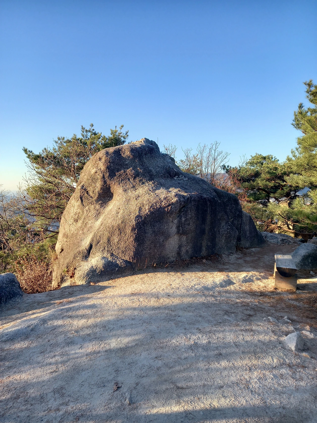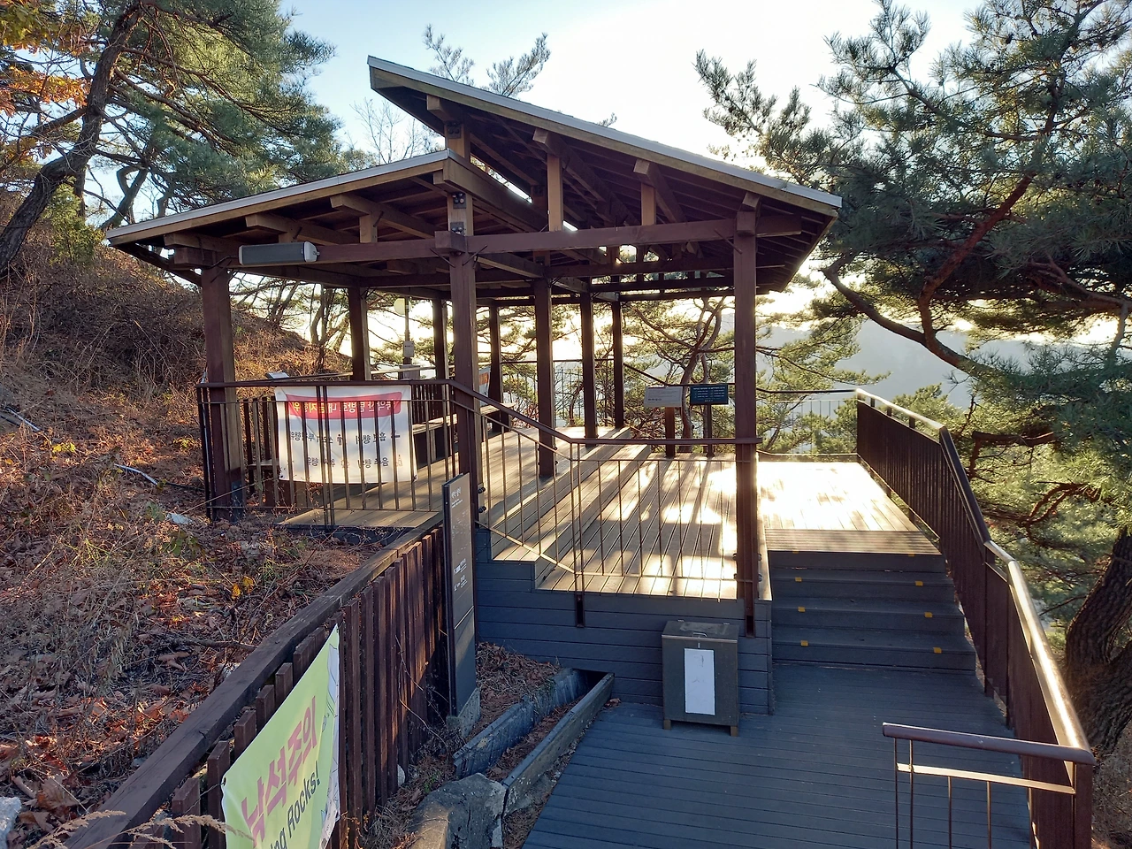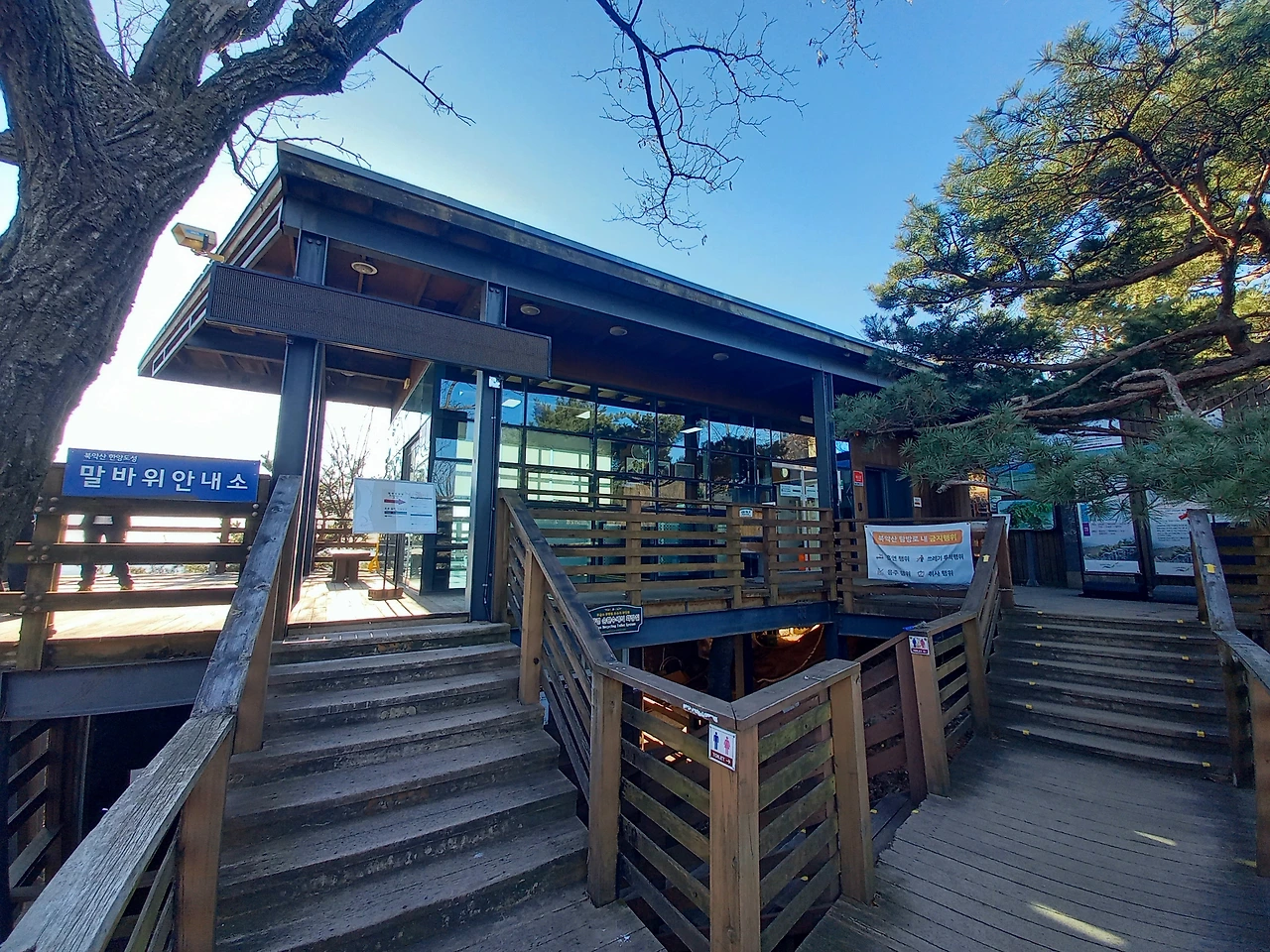 워낙 경사가 심한 계단길이 지속되다 보니 길지 않은 거리에, 쉼터가 두 개나 있다. 백악 쉼터와 돌고래 쉼터. 하산길이라 쉼터에서 쉬지 않고 그대로 계속 내려갔다.