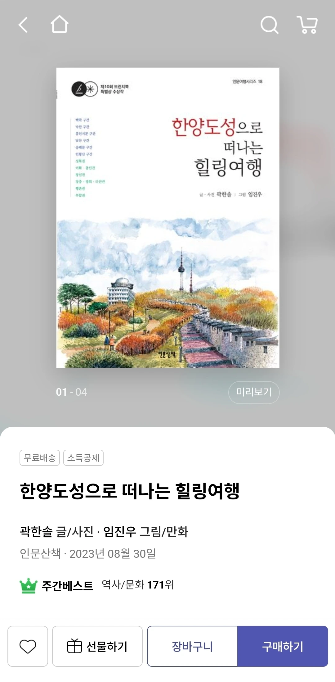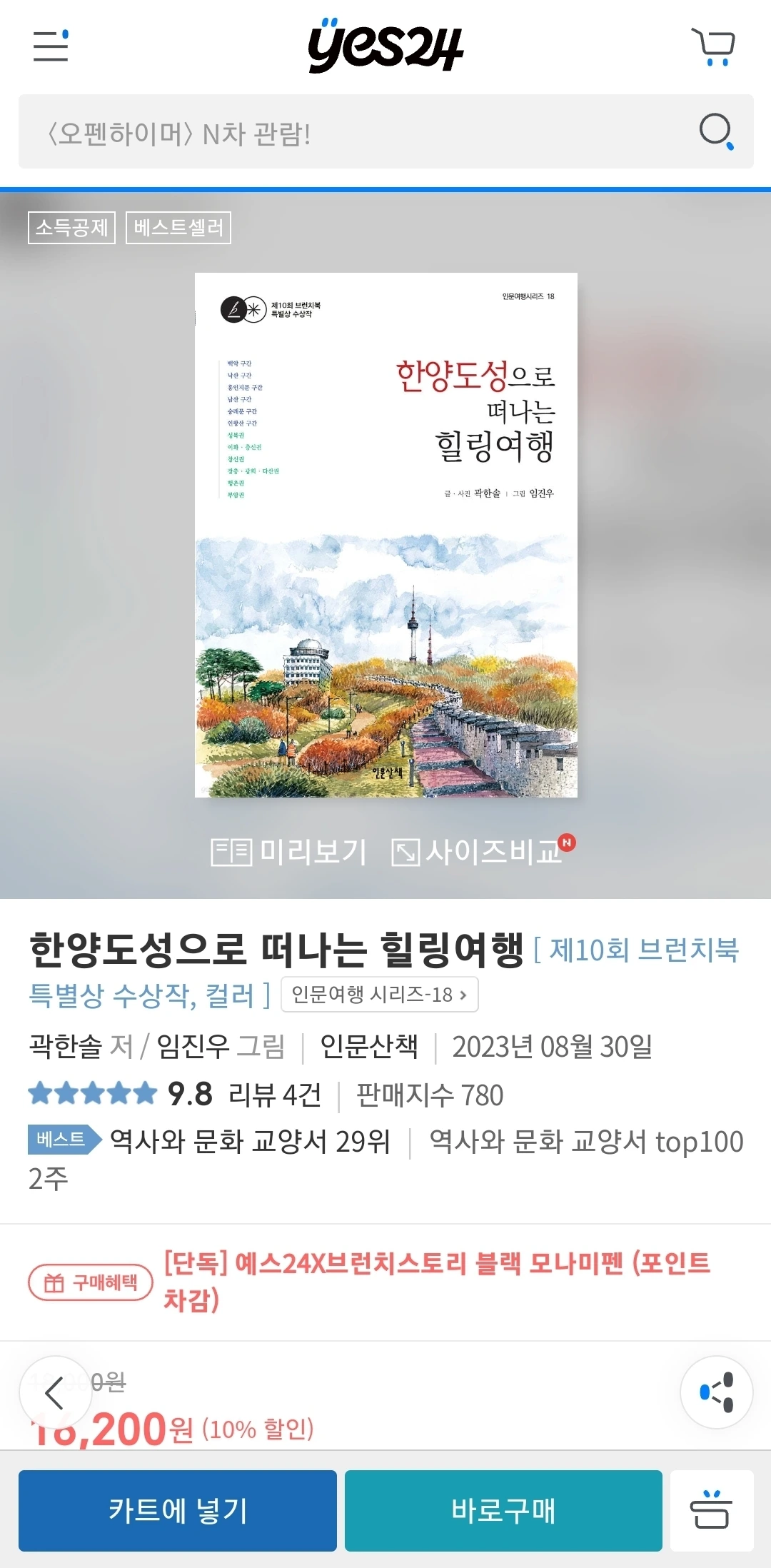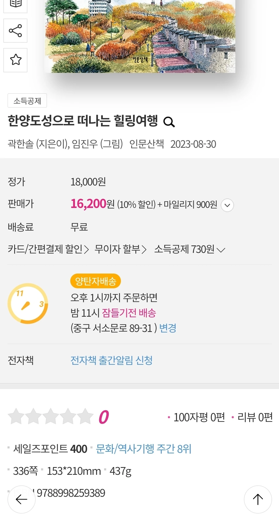 그러다 순위권에서 며칠간 사라지길래 이제 끝인가 보다 했다. 그런데 또 잠깐 한 주간 순위에 들다가 이틀 안 보이다 또 최근 다시 보였다. 아마도 전국의 수많은 도서관 중 일부에서 구매한 게 아닌가 싶었다. 반짝은 못해도 이렇게 며칠에 한 두 권이라도 꾸준히 나가는 게 더 좋다. 초판 천 권 다 팔려도 인세 수익은 200만 원이 안될 것이다. 수익보다는 도서 소재인 "한양도성" 탐방의 아름다움과 힐링 요소를 널리 알리고 싶은 것과 출간의 기회를 준 출판사 인문산책을 위해 판매도 좀 됐음 했다.