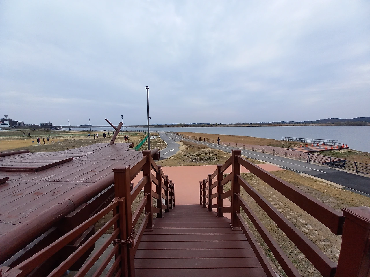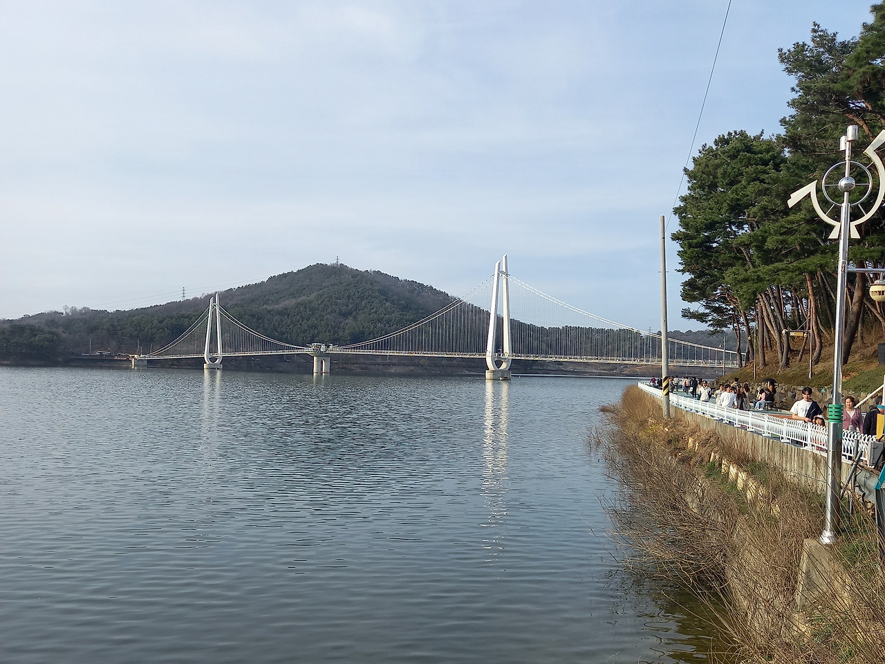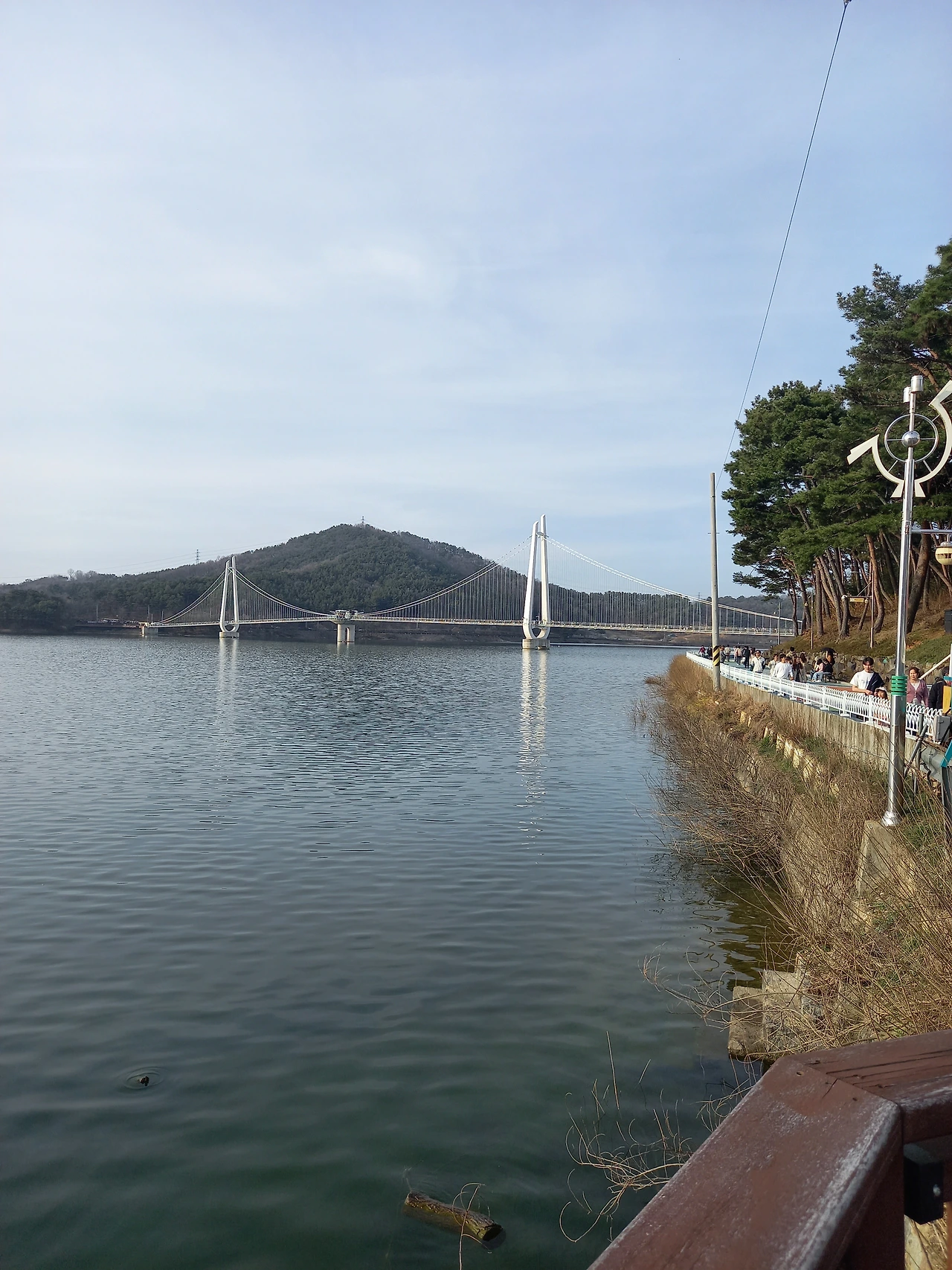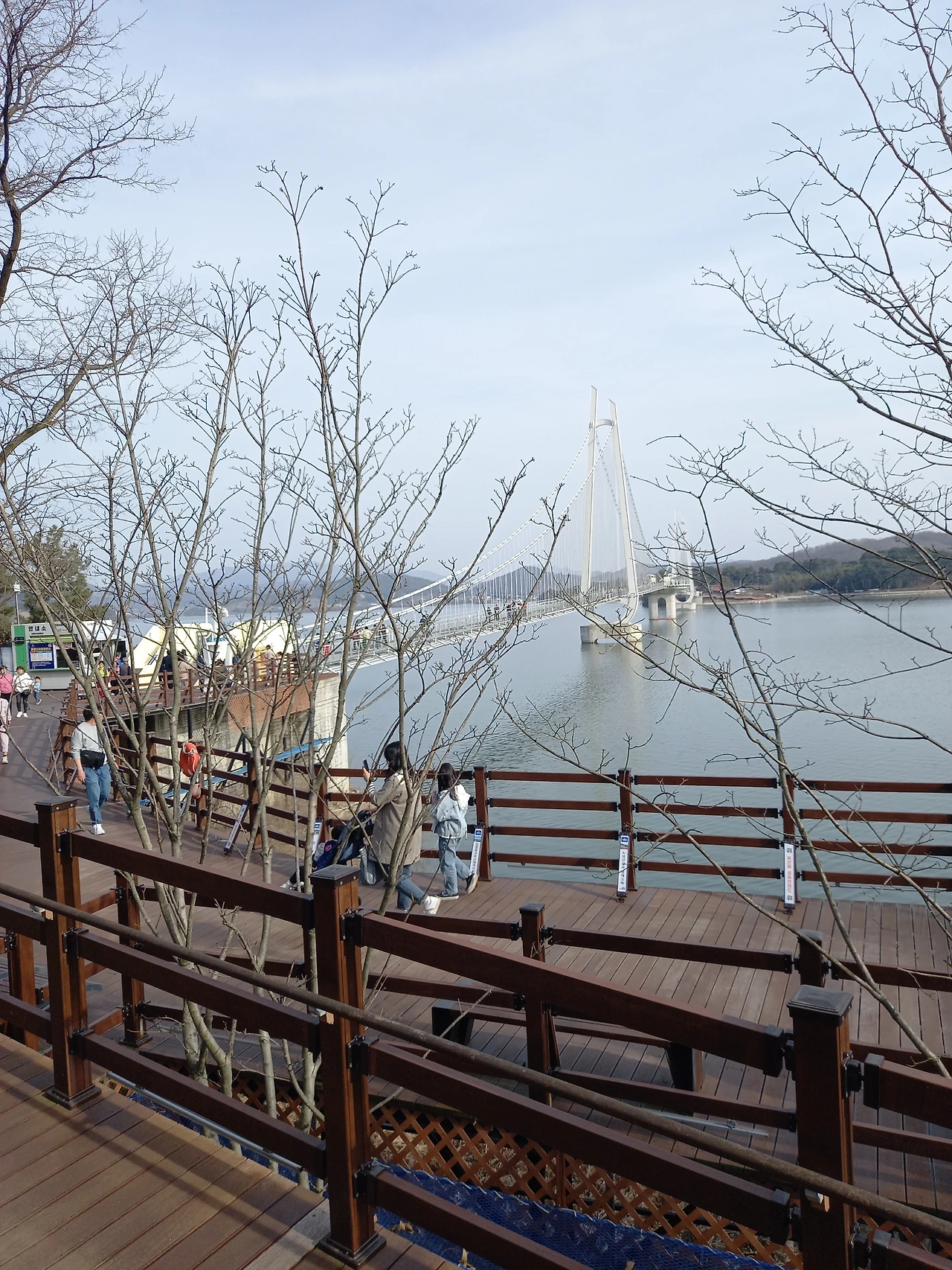 반은 철제, 반은 나무로 구성된 바닥이 예뻤고 일부는 유리로 돼 있어 아래를 바라볼 수 있었다. 한가운데 지점에는 쉬어갈 수 있는 쉼터 같은 공간이 있어 이곳에서 한참을 물멍 했다. 다리를 완전히 건너간 뒤 다시 되돌아 건너왔다. 인산인해 가득했던 딸기 축제 구경하면서 진이 빠졌었는데, 탑정호에서 회복했다.