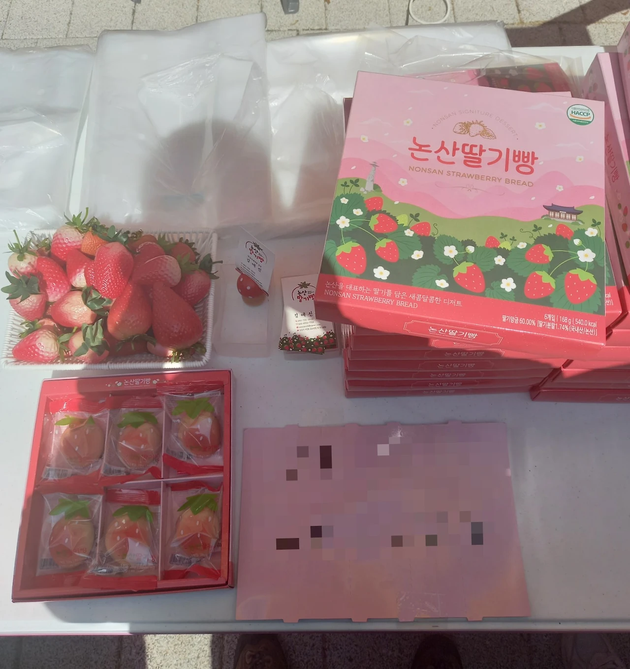 기차 타고 논산역에 와서 논산 시내에서 쏘카 빌려 여행을 했는데 결국에는 다시 기차 타고 상경해야 하는 상황이라 물건을 많이 사진 못했지만, 줄 서서 기다린 딸기 '오모찌'(1인당 4개 한정 판매), '딸기빵', '킹스베리 딸기' 등 한 번도 안 먹어 본 것 위주로 샀고 만족스러웠다.