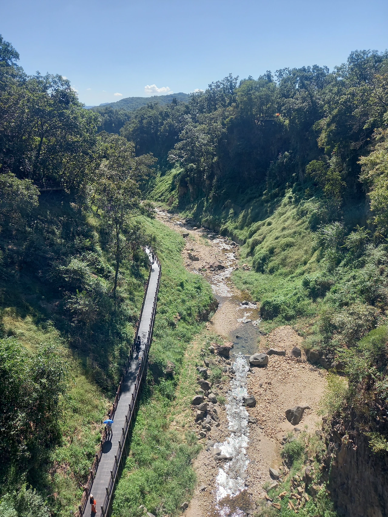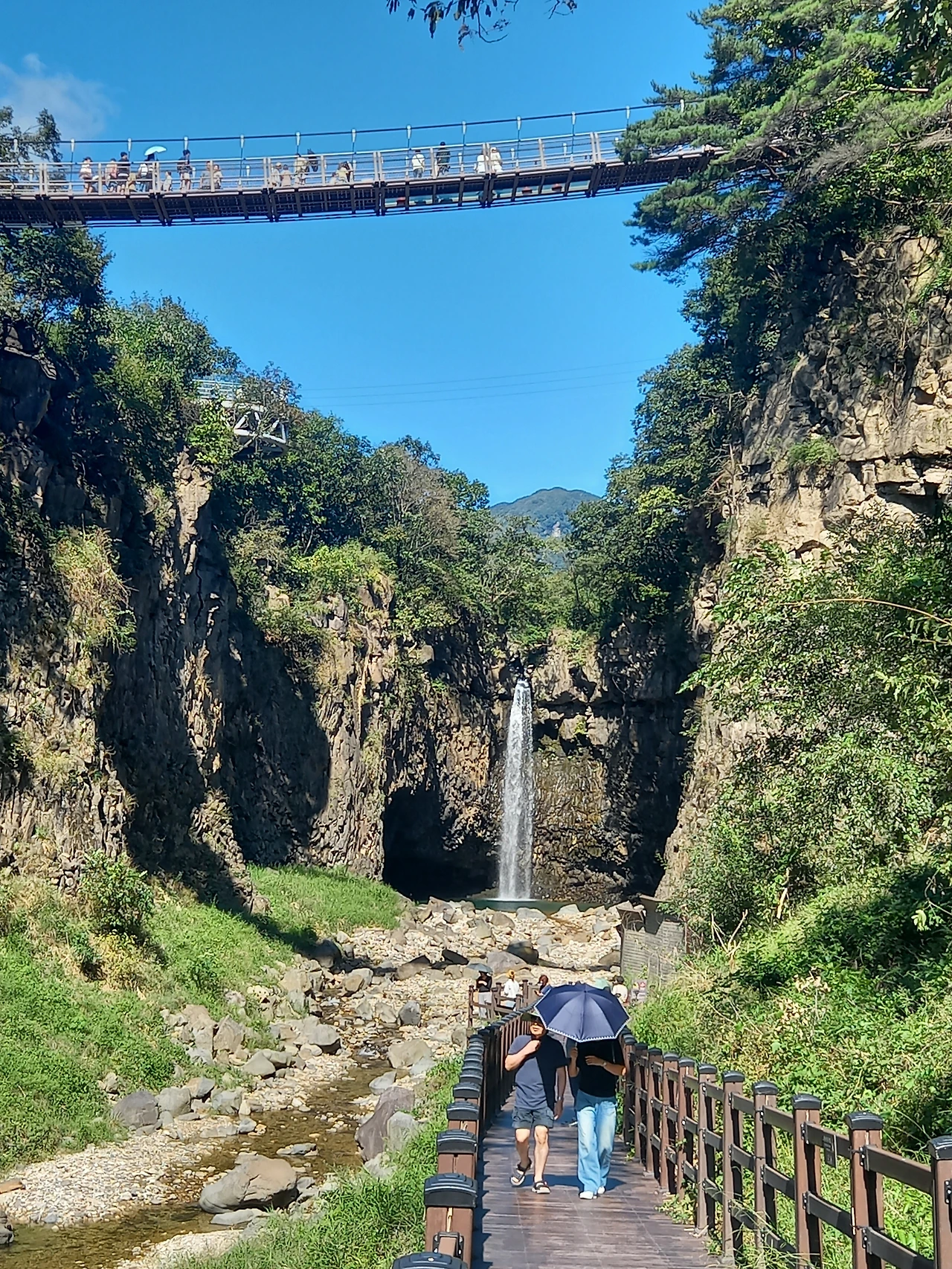뜻밖에 방대한 꽃밭의 등장과 그 아름다움에 취할 수밖에 없었다. 기분 좋은 마음을 가지고 재인폭포에 도달했다. 폭포의 정확한 지점은 모른 채, 일단 사람들이 가는 쪽으로 출렁다리를 건너기 시작했는데... 어!? 정면에 재인 폭포가 흐르고 있더라. 딱 한 단어로 표현하자면 "최고"였다.