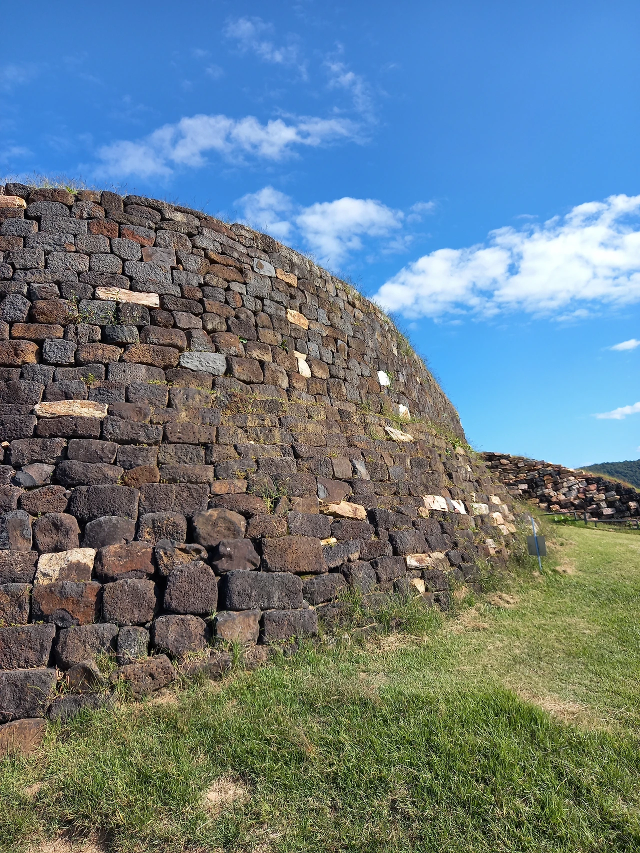 성벽 돌을 자세히 보니 구멍이 송송 나있는 게 인상 깊었다. 이것은 틀림없이 현무암이었다. 고구려 성벽의 95%가 주변에서 쉽게 구할 수 있는 현무암으로 쌓았단다. 설명문을 보니 주변에서 쉽게 구할 수 있는 현무암은 돌이 질기고 깨기가 힘들어 다루기가 쉽지 않은데 고구려의 석공들의 기술이 얼마나 뛰었는지를 알 수 있는 대목이다. 신라의 석공들이 성을 차지했을 때 현무암을 다루는 기술을 단기간에 익힐 수 없어서 멀리서 편마암을 가져와 성벽을 쌓았다고 한다. 성에 올라 환상적인 광경의 아름다움을 만끽했다. 한양도성에서 바라본 경관 이후로 최고의 경관이었다.