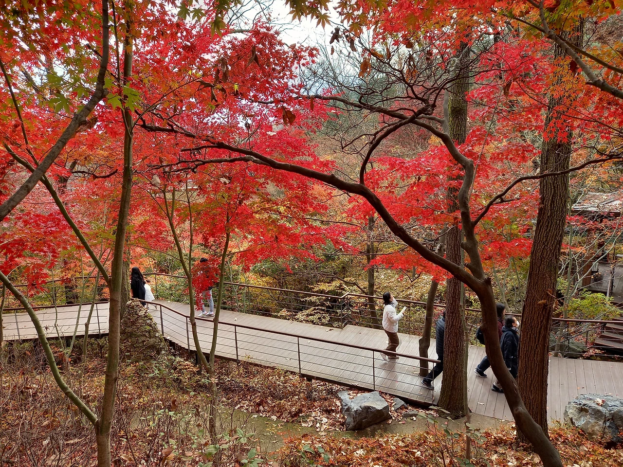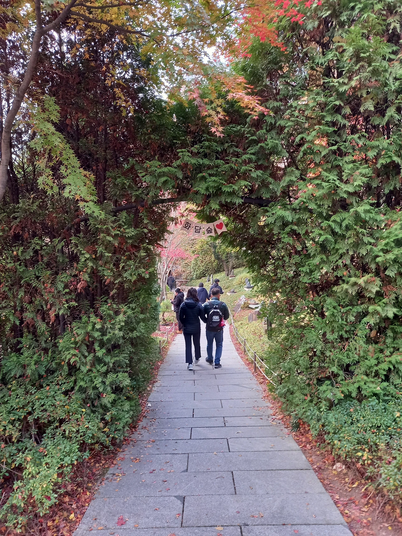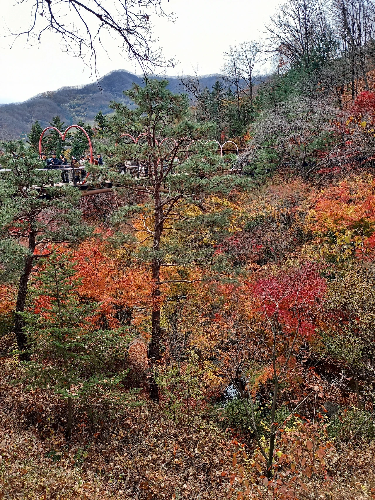 자연생태관과 이끼원, 그리고 하트 조형물이 있는 다리를 건너는 길을 느리게 걷는 동안은 사방팔방, 근거리와 원거리까지 저마다 조금씩 다른 알록달록한 색상의 단풍을 원 없이 구경할 수 있었다. 환상적이었고, 그야말로 장관이었다. 근 몇 년 간 본 단풍을 다 합친 것보다 더 많은 단풍을 봤다. 군데군데 계단 등으로 빠르게 올라갈 수 있는 길이 있었지만 그러지 않았다.