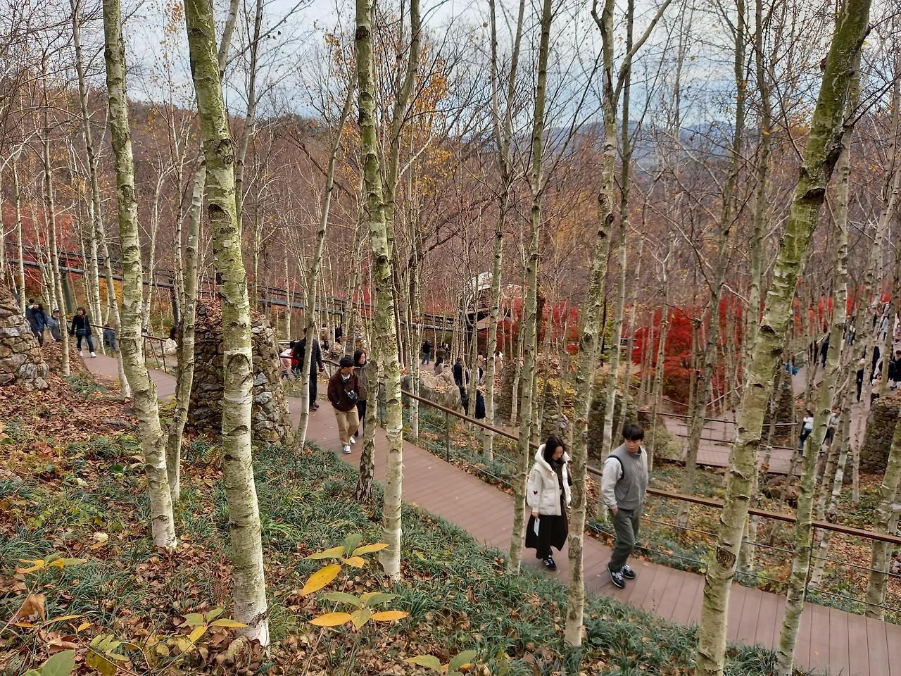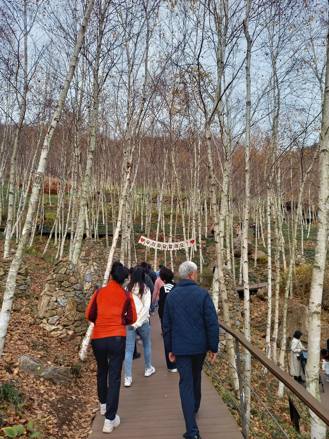 울긋불긋함이 잠시 옅어지고 하얀 나무들이 등장했다. 자작나무 숲에 다다른 것이었다. 자작나무가 잠깐 보이다가 사라질 줄 알았는데 숲은 꽤나 방대했다. 알고 보니 자작나무가 무려 2,000여 그루나 된단다. 봄에는 노란색 수선화가, 좀 더 이른 가을에는 보랏빛 맥문동이 조화를 이룬다는데 오히려 주변에 화려한 색상이 없이 하얀빛의 자작나무들만이 넓게 펼쳐져 있는 모습이 역시나 장관이었다.