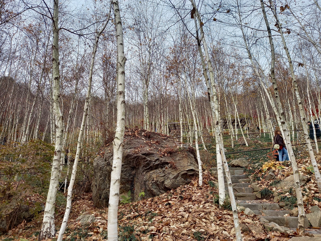 반환점 위치, 흔히 고사리류라고 불리는 양치식물이 있는 양치식물원을 지나서부터는 내리막길이라 더 편히 그리고 조금 속도감 있게 걸어 나갈 수 있었다. 여전히 곳곳에는 아름다운 단풍 풍경이 눈에 들어왔다. 빨간색, 덜 빨간색, 버건디 색, 단풍이 들기 전 녹색까지 각양각색의 단풍을 보는 재미가 있었다. 그러다 자작나무숲을 봤던 것과 비슷한 느낌의 지점에 도달했다.