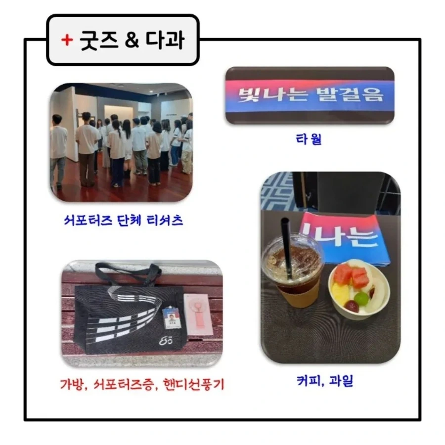 발대식 배너를 배경으로 한 사진과 굿즈(기념품 가방과 서포터즈증, 휴대용 선풍기)
