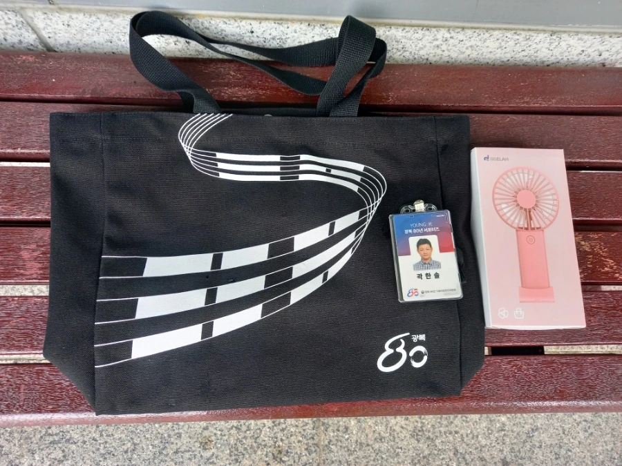 각 지역에서 10대부터 50대까지 다양한 연령대의 서포터즈들이 본 시작 시간보다 이른 시간에 속속들이 모였는데요. 바로 사전 등록과 단체 티를 착용하기 위해서였습니다. 명부 서명 후 서포터즈증과 가방을 수령받았는데 그 속에는 새하얀 단체 티와 함께 꼭 필요했던 휴대용 선풍기도 들어있었습니다. 모두 “광복 80”이라는 글씨가 새겨져 있어서 서포터즈로서 활동이 개시됨이 실감 나더라고요.