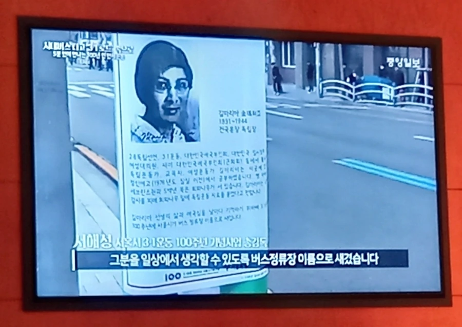 다과와 커피를 가지고 자리로 돌아와 섭취하면서 무대 양쪽의 모니터에서 송출되고 있는 “시내버스 타고 3·1로드 속으로”라는 제목의 영상을 보았는데요. 이 짧은 영상이 제게 굉장히 인상적이었습니다. 독립운동가를 일상생활 속에서 쉽게 만날 수 있도록 버스정류장 이름을 독립운동가의 이름을 표기하였다는 내용이었습니다.