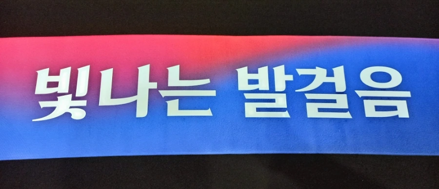 슬로건 "빛나는 발걸음 새로운 길"의 앞 문구를 기재한 타월 / 준비된 다과