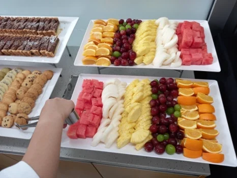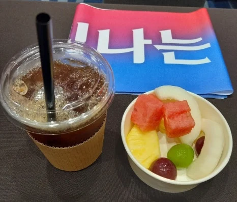 책상 위 슬로건이 적인 타월을 활용한 단체 사진 촬영을 끝으로 발대식 행사가 끝나고 쉬는 시간이 주어졌습니다. 회의실 바깥에는 먹음직스러운 다양한 쿠키와 과일 등 다과와 아이스커피가 마련돼 있었습니다. 뜻밖의 먹 거리에 기분이 한층 좋아졌답니다!