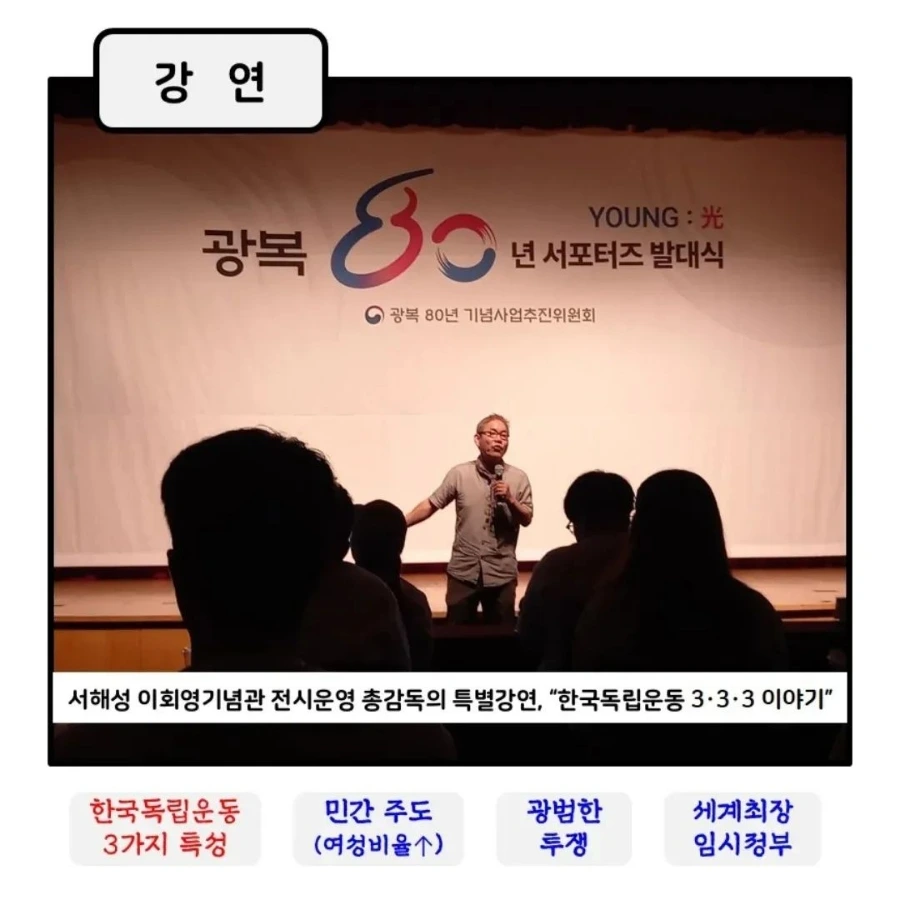 너무 귀한 강의를 들었습니다. 광복의 의미를 오랜 기간 널리 알리는데 애쓰신 서해성 강사님께 진심을 담아 존경을 표합니다. 해주신 말씀은 이 자리에 모였던 많은 서포터즈들에게 필이 큰 울림으로 작용했을 것이며 앞으로 광복의 의미와 80년 기념사업을 알리는 데 밑거름으로 작용할 것이라 확신합니다.