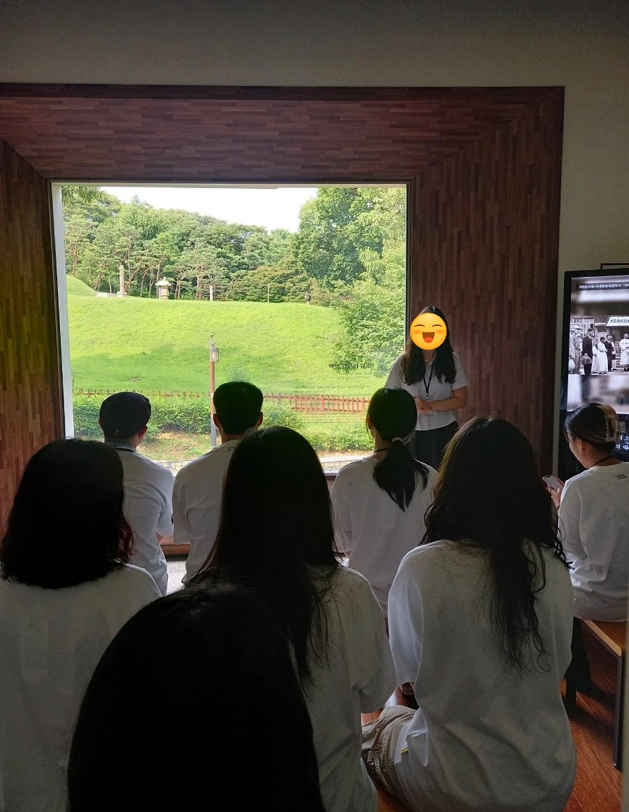 대한민국 임시정부에 참여한 김구 선생에 대한 해설사의 설명 모습 / 창 너머로 보이는 김구 선생 묘역