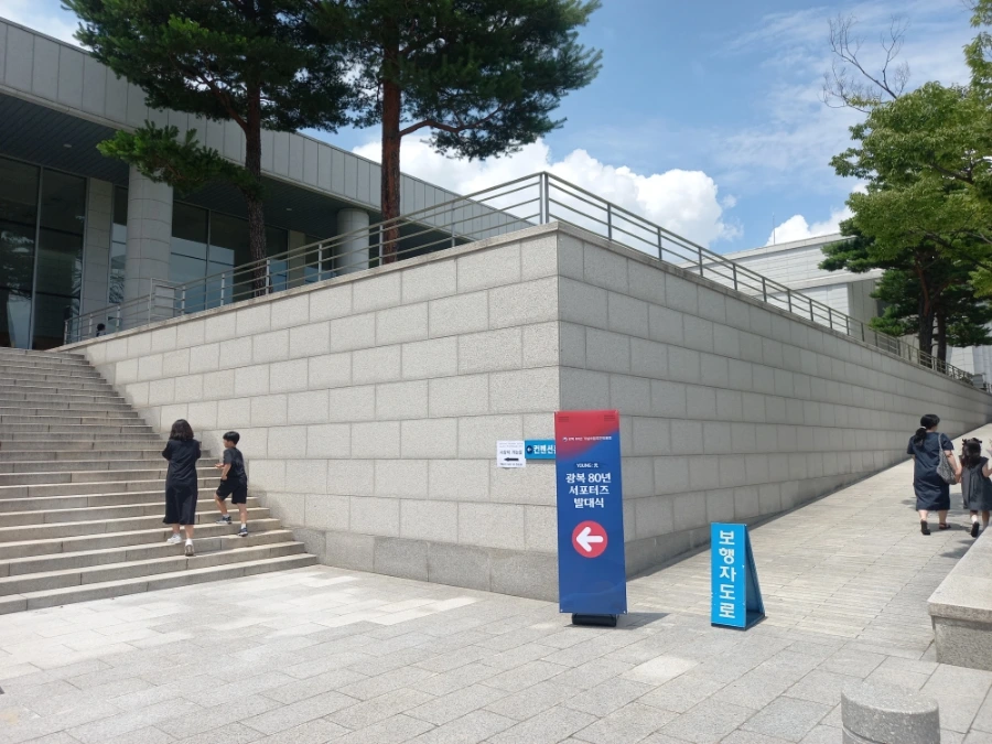 시작 시간이 다가오자 서포터즈들은 단체 티를 착용한 채로 1층 대회의실에 입장, 14시 정각이 되자 기다리고 기다리던 발대식 행사가 시작됐습니다. 발대식 행사는 먼저, 국민의례애국가 제창이 있었고요. 이어서 광복 80년 기념사업 추진위원회의 공식 유튜브에 업로드되어 있으며 댓글 이벤트도 겸했던 두 영상, <나다움을 되찾아!>와 이번 기념사업의 “슬로건”이자 동명의 제목이기도 한 영상을 시청했습니다.