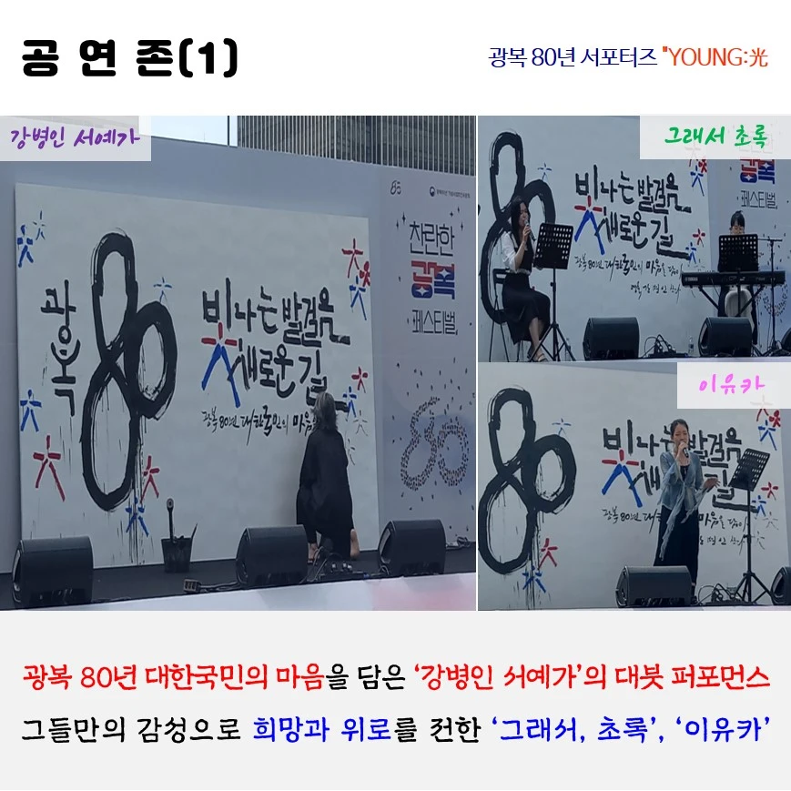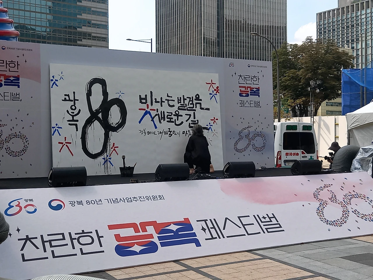 이날 현장에서 가장 많은 플래시가 터졌으며 많은 참여자들이 영상으로 남겼던 공연으로 가히 하이라이트 무대였다고 해도 과언이 아니었습니다. 광복 80주년을 맞이하는 대한민국 국민의 마음을 담아 꾹꾹 문구를 새긴 서예가 강병인 장인께 감사의 마음을 전합니다.