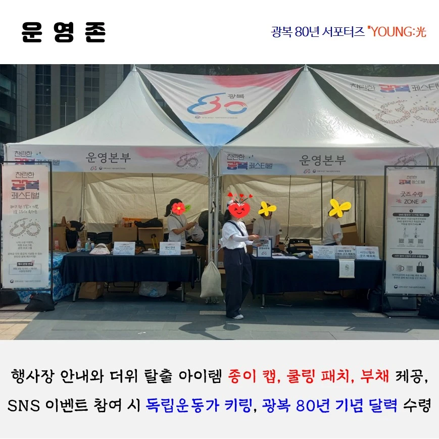광복 80주년 기념행사, 찬란한 광복 페스티벌 8월 2일 토요일 12~19시 서울 청계광장에서 열렸습니다. 이 행사는 광복 80년 서포터즈 “YOUNG:光”의 공식 필수 참여행사 이기도 한데요. 서포터즈 발대식 이후 각자 각 기관에서 진행 중인 행사를 개별적으로 참여하는 것이 아쉬웠는데 광복절이 2주 앞으로 다가온 시점에서 이렇게 대 국민과 함께하는 행사에 참여하게 돼 제 마음은 전날부터 들떴답니다.
