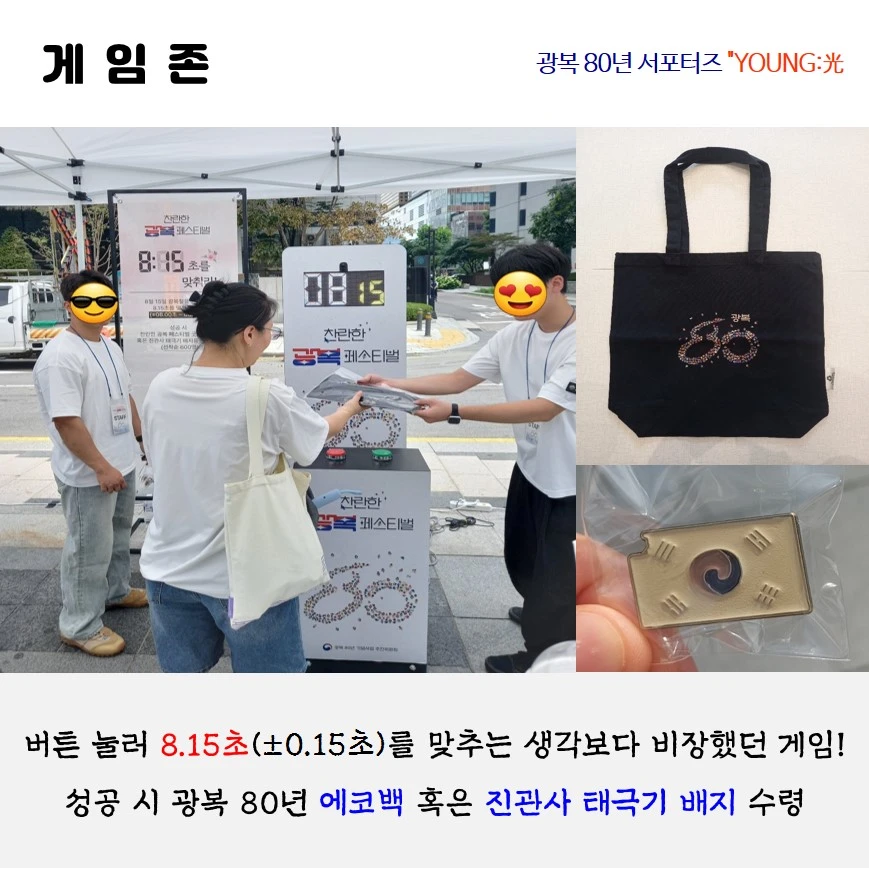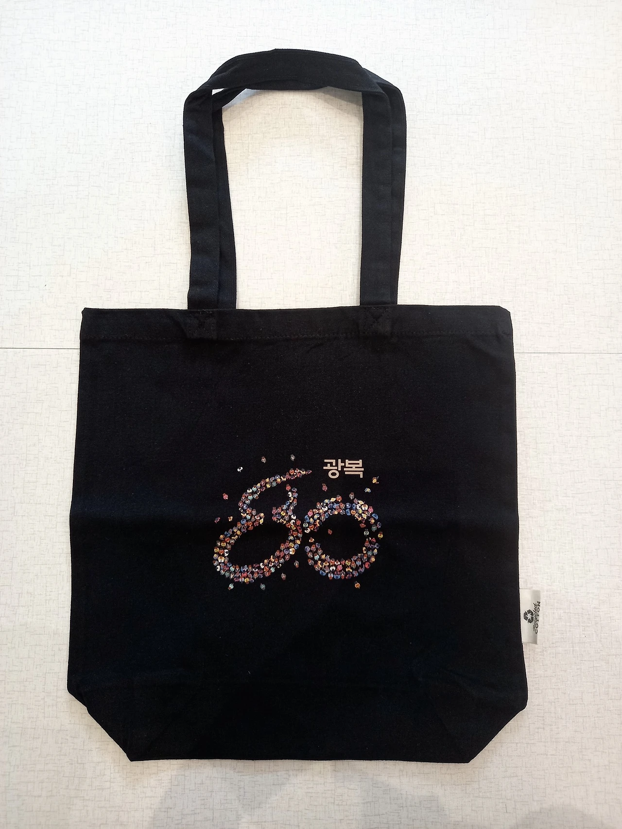경품은 진관사 배지와 에코백 중, 자주 가지고 다니며 생활 속에서 광복의 의미를 늘 생각할 수 있을 것이라는 마음에 광복 80 로고가 찍힌 에코백을 선택했습니다.