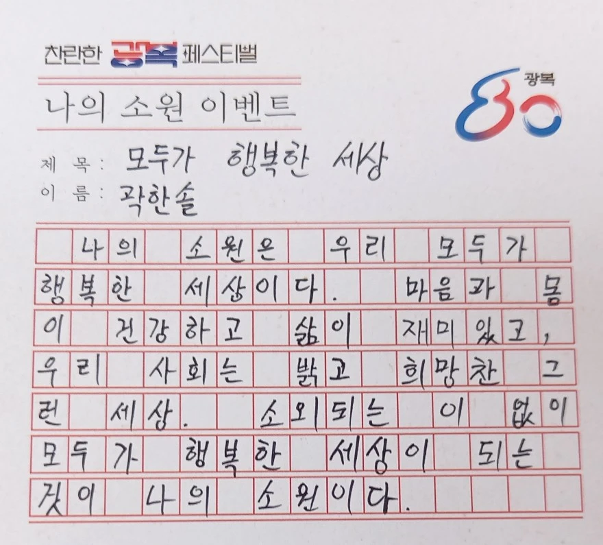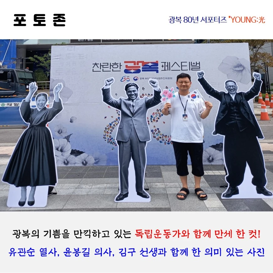 저의 모습을 담은 사진을 통해 광복 페스티벌과 광복 80주년을 기념한 행사에 참여한 이날의 추억을 되새길 수 있었기 때문일 것입니다. 이를 볼 때마다 광복의 의미도 재차 생각해 볼 것이기에 잘 보관하려 합니다.