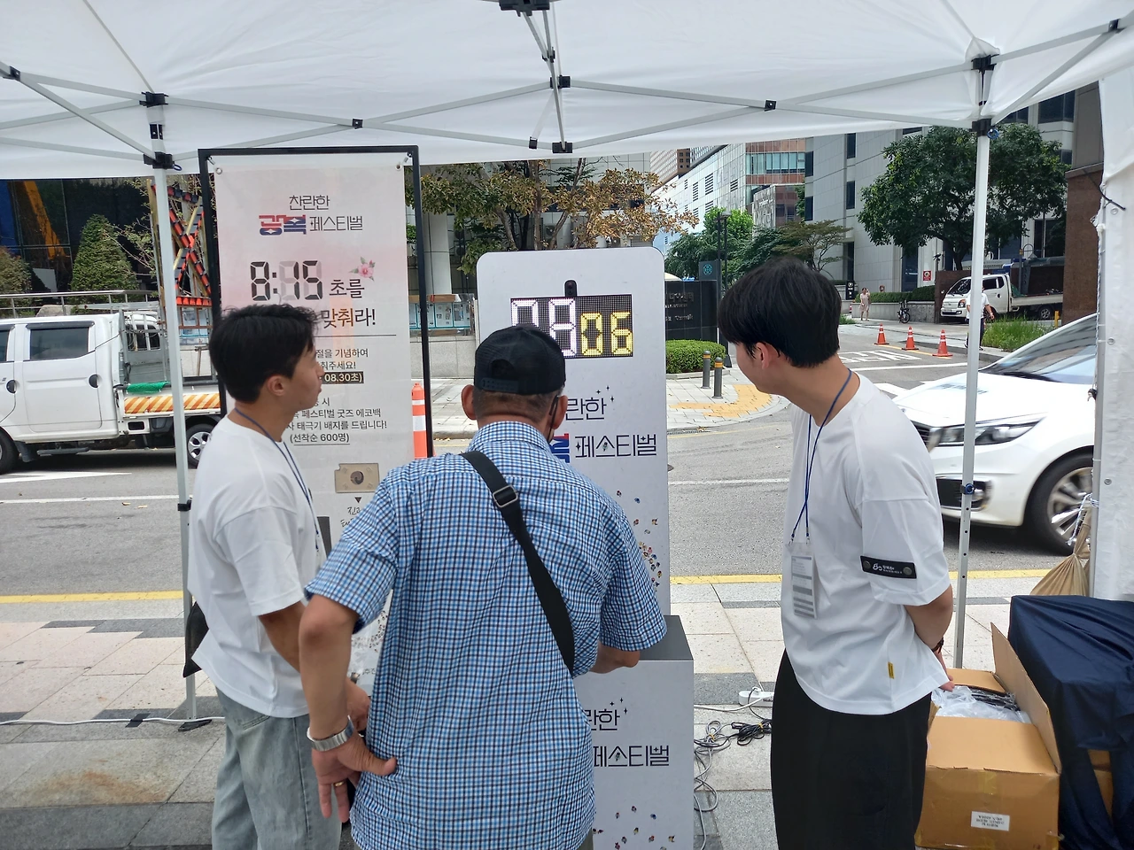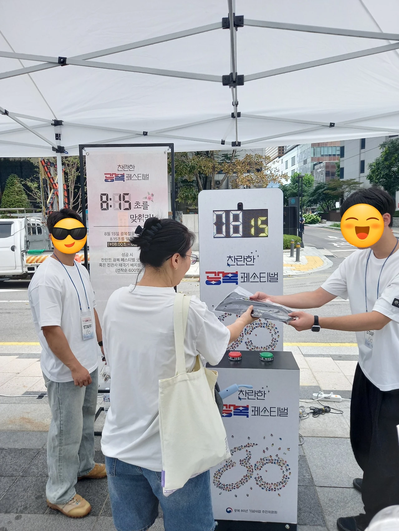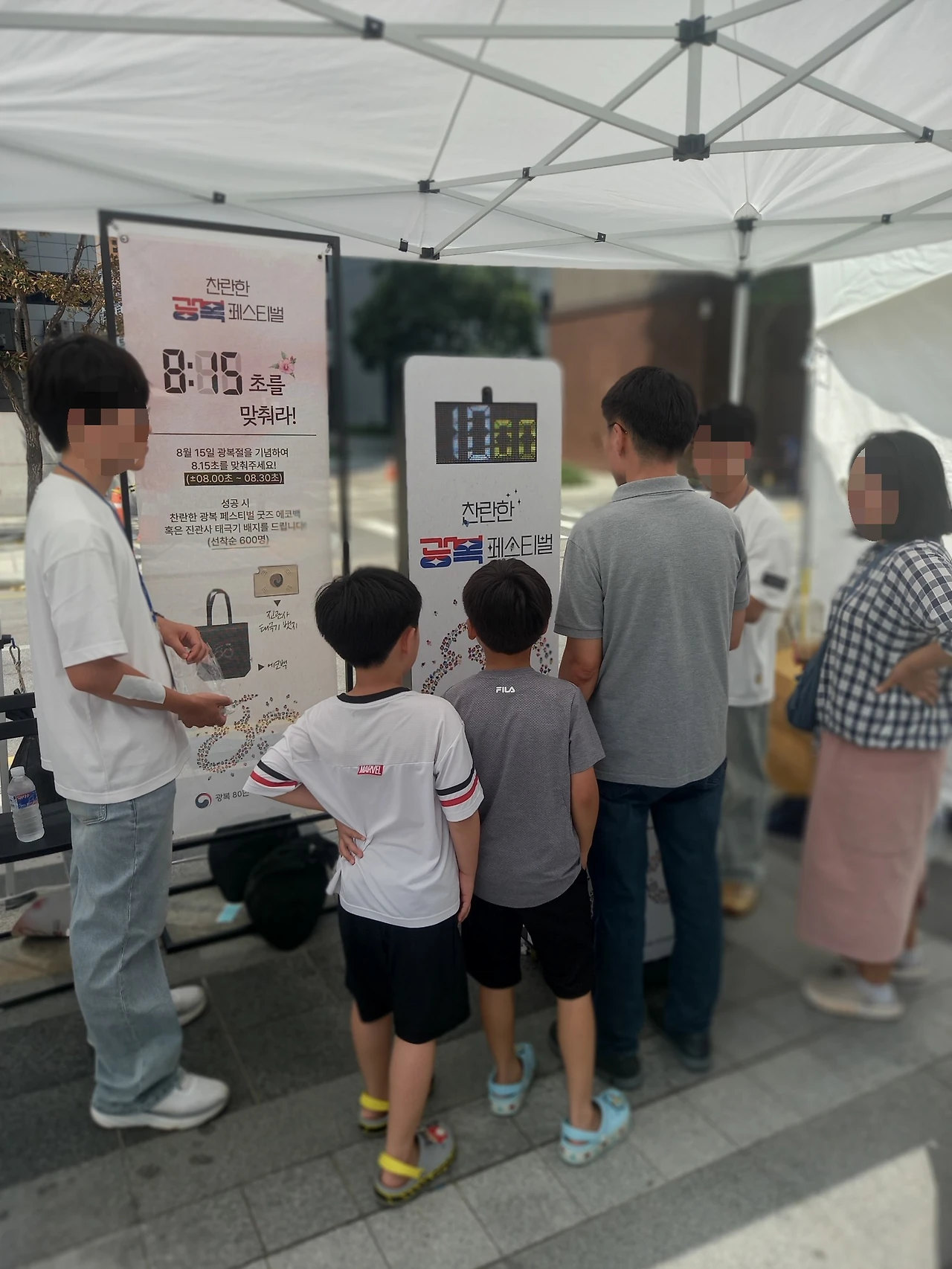 직관적으로 어른인 저에게도 가장 눈에 띄는 곳이, 이날 단연 가장 많은 인기 부스이기도 한 8.15초 광복타임인데요. 10초에서 시간이 흐르면 정지 버튼을 눌러 8.15초에 멈추는 게임입니다. 정확히 8.15초를 맞추는 것은 역시나 매우 어려운 일이다 보니, 오차 범위 ±0.15초까지 들면 선물을 받을 수 있었습니다. 아무튼 행사 막 시작한 시점임에도 불구하고 대기줄이 있어 바로 줄 섰습니다.