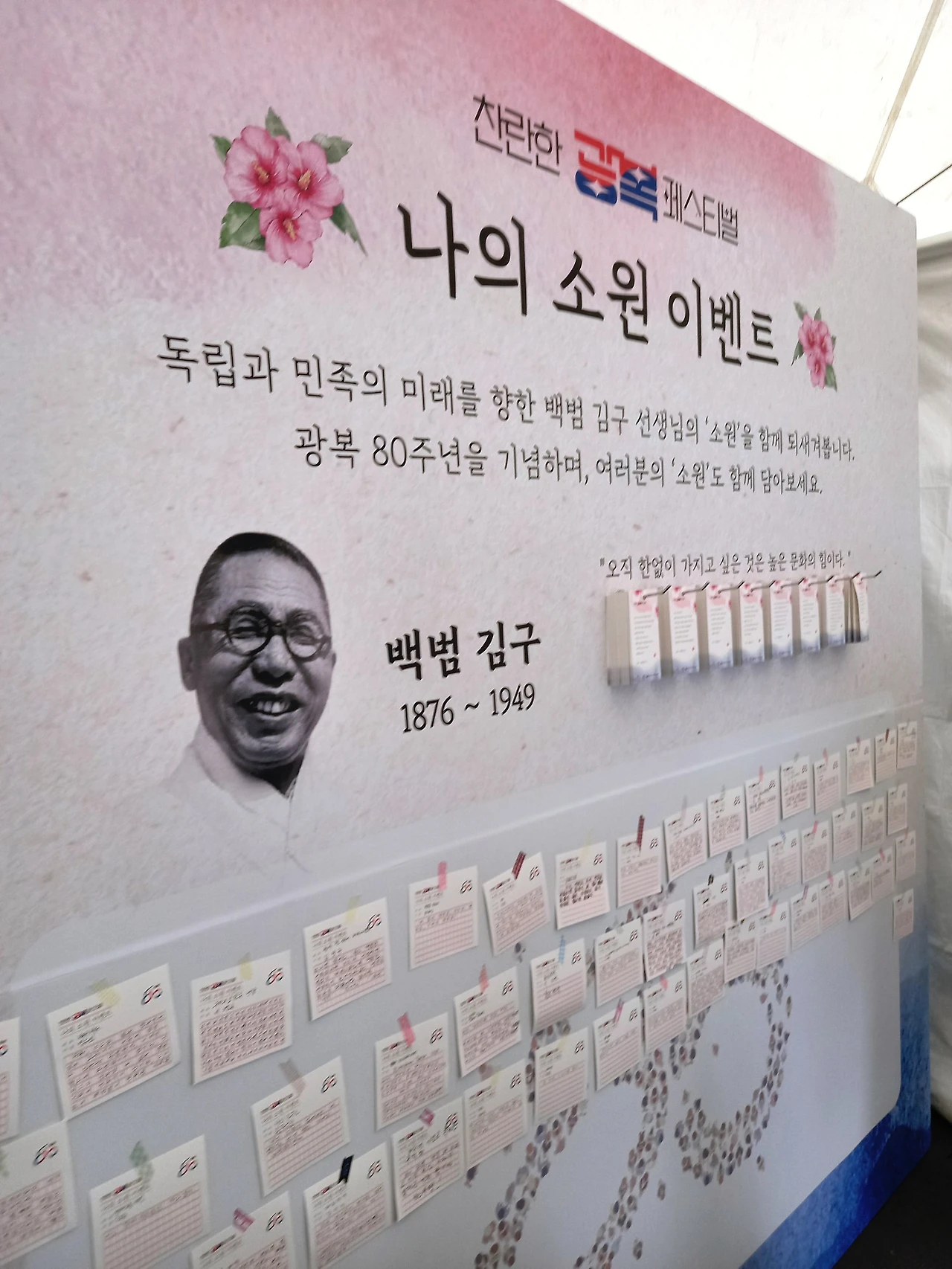 온라인으로 먼저 참여를 하기도 했던 문학존의 나의 소원 이벤트에는 참여했습니다. 평소 글을 쓸 때 늘 가득 채우는 편이기에, 한 줄의 15칸이 총 7줄로 구성된 원고지를 가득 채워보았습니다. 다음 참여자들이 줄을 서고 있었기에 오랫동안 생각하지는 않았고요. 평소 제가 생각해 왔던 제 마음, 모두가 행복한 세상이 왔으면 하는 제 바람을 퇴고 없이 쭉 써나갔습니다. 독립 후의 김구 선생께서 민족의 화합을 위해 애쓰셨던 것을 생각하면 광복 후 선생의 소원은 위와 비슷하지 않았을까 하는 생각을 해봤습니다.