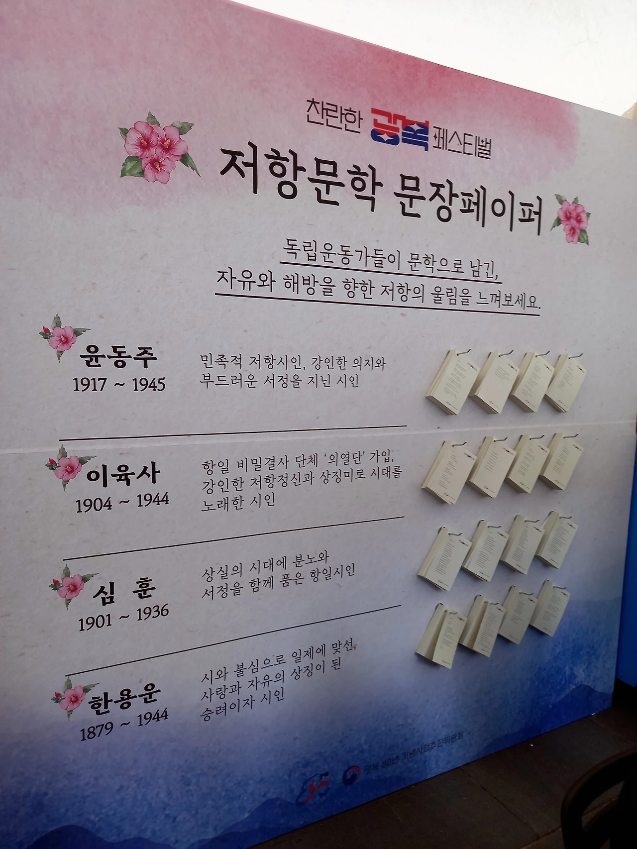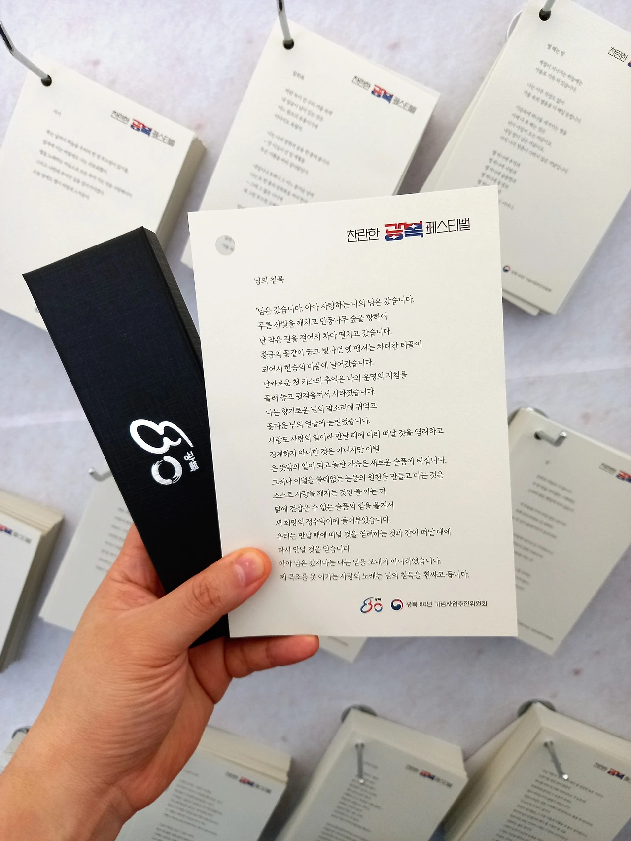 윤동주의 별 헤는 밤, 이육사의 광야, 심훈의 그날이 오면 등 메시지월에서는 저항 시인들의 시 작품을 감상할 수 있었습니다. 시 한 구절 한 구절에서 독립을 바라는 시인의 간절한 바람이 느껴져 눈물이 나더라고요. 시 구절이 적힌 메시지 카드를 한 장 가져갈 수 있었는데 다 가져가고 싶었지만, 근래 광복 80주년 기획전시 <무궁화 꽃이 피었습니다> 전시를 다녀오며 만해 한용운 선생의 마음을 보았기에 그의 대표 시 “님의 침묵”이 적힌 메시지 카드를 택했습니다.