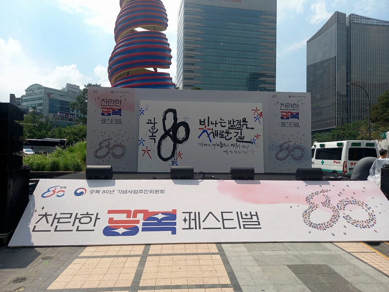 무엇인가를 기념해 설치하는 조형물, 그 과정과 내용이 합당하다면 다소 비용이 들더라도 적극 환영하는 마음을 가지고 있습니다. 이런 의미에서 광복절 80주년을 맞아서도 단발성 행사로 끝내는 것이 아니라 이들 행사에서 사용한 여러 가지 설치 및 조형물들이 어딘가에서 지속적으로 남으면 어떨까 하는 생각입니다. 잠시 조형물을 살펴본 다음 이내 바로 아래 행사 현장에 도달했습니다.