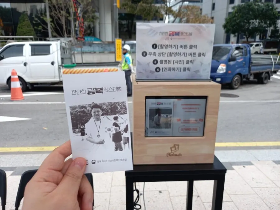 게임존 다음으로 눈길이 갔던 부스는 단연 그 바로 왼쪽의, 독립운동가와 함께하는 포토존인데요. 이에 앞서 즉석 포토 인화기 상자를 확인, 태극기 스토퍼를 가지고 사진을 촬영한 다음 인화까지 완료했습니다. 이날 행사에서 화려한 혹은 예쁜 굿즈들 많이 받았었는데요, 이에 못지않게 얕고 작은 종이에 인화된 이 사진 한 장이 소중하게 다가왔습니다.