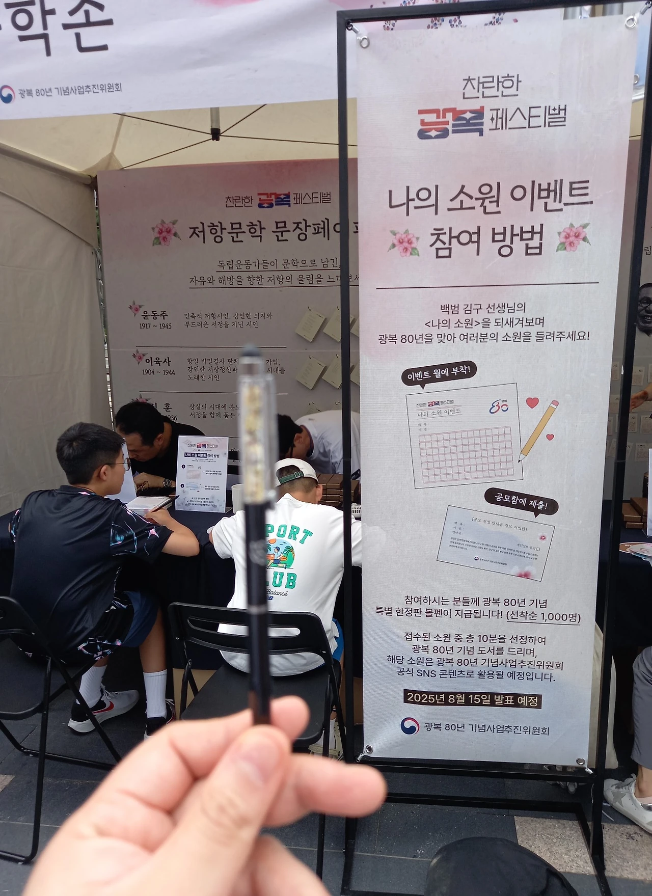 저의 바람을 표현한 자체로도 좋았는데, 광복 80년 기념 특별 한정판 볼펜도 받을 수 있어 정말 기뻤습니다. 참고로 접수된 소원 중 총 열 명을 선정해 광복 80년 기념 도서가 제공되고 광복 80년 기념사업추진회 공식 SNS 콘텐츠로도 활용된다고 하네요. 8월 15일에 발표되는 열 분의 선정자 분들은 큰 선물과 영예를 얻게 되시겠네요. 미리 축하의 말씀을 올립니다!