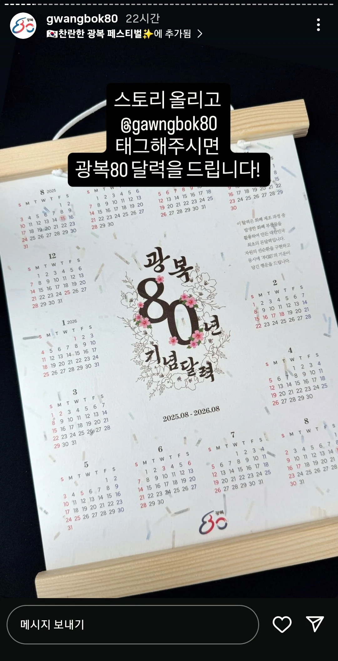 또한, 인스타그램 피드에 행사 사진을 올리면 광복 80년 기념 달력 굿즈를 주는 이벤트도 추가적으로 진행되었답니다. 독립운동가 키링에 남들에게 자랑하고 싶을 정도로 예쁜 광복 80년 기념달력까지. 당연히 놓칠 수 없었지요.