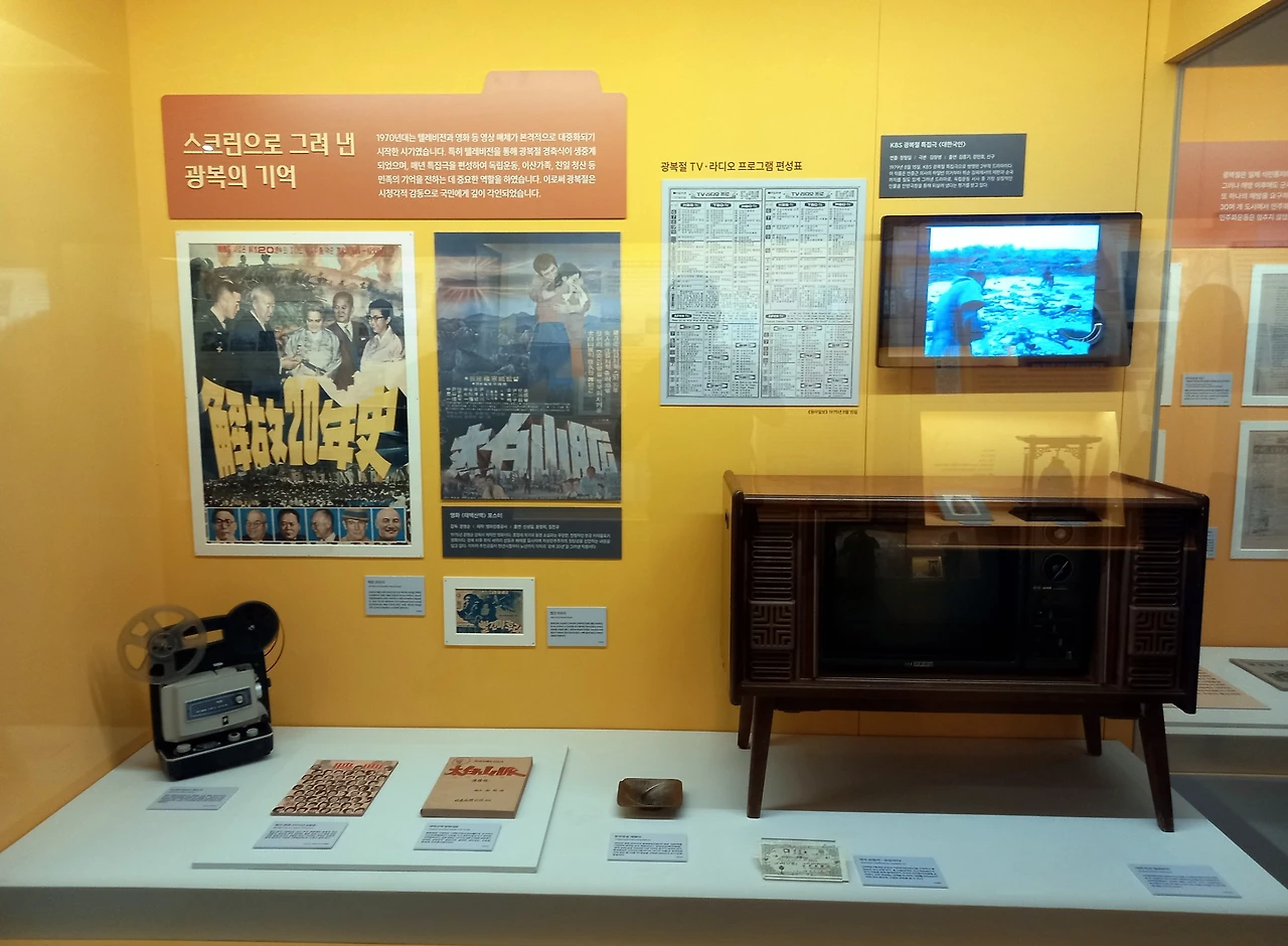 그런데 이보다는, 여기서는 1부에서도 다뤄진 것처럼 국가가 정당성을 강화하기 위한 목적으로 영화∙텔레비전∙라디오 등 매체를 활용했다는 이야기 그리고 이후 광복일의 민주화 운동 등 다양한 이야기가 이어졌습니다. 무엇보다도 가장 인기 있는 전시물은 옛날 영사기, TV와 오디오 등으로 관람객들의 시선을 제대로 끌었어요.