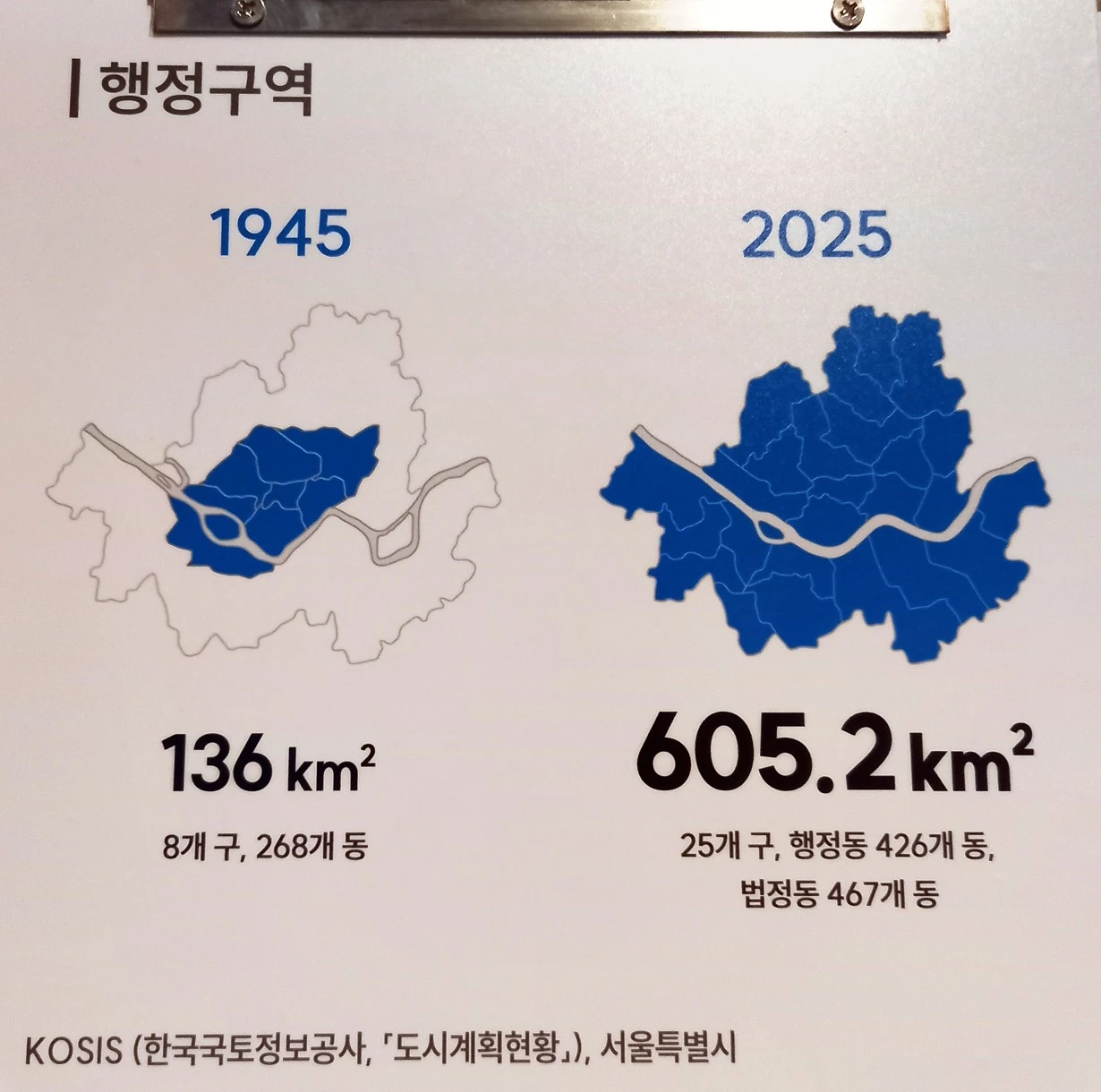 서울이 고향이 아닌 저는 “서울은 얼마나 커졌을까?”라는 질문의 답도 궁금했는데 1945년도 서울은 행정구역 상 불과 8개 구, 269개 동에 불과했었습니다. 지금은 25개 구, 행정동 426개 동인데 말이죠. 저처럼 지방에서 자라온 분들은 서울이 수십 년 전에도 컸을 거라고 알고 있는 분들 있을 겁니다. 실은 지금의 모습을 갖춘 게 그렇게 오래되지는 않았답니다. 인포그래픽 형태로 보기 쉽게 그리고 재미있게 보여준 서울의 변천사였습니다.