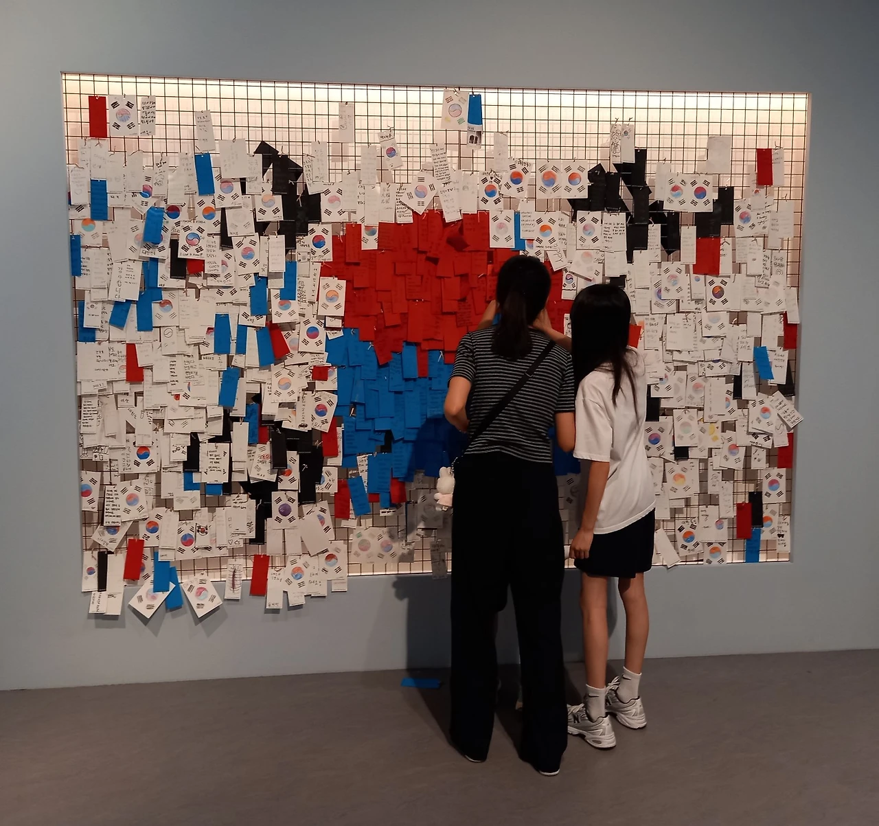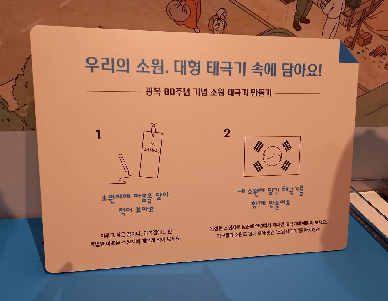 “끝난 줄 알았는데 이제 시작이잖아?”라는 생각을 할 수 있습니다. 어린 자녀와 함께 온 부모라면 말이죠. 이제 전시나 행사에 있어서 이 프로그램은 필수입니다. 바로 체험 프로그램입니다. 태극기를 엽서에 색을 칠하고, 또 빨∙파∙검∙흰의 태극기에 들어가는 색상의 소원지에 소원을 적은 다음 이를 정면의 대형 게시대에 걸어 모두가 함께 태극기를 완성해 나가는 공간입니다.