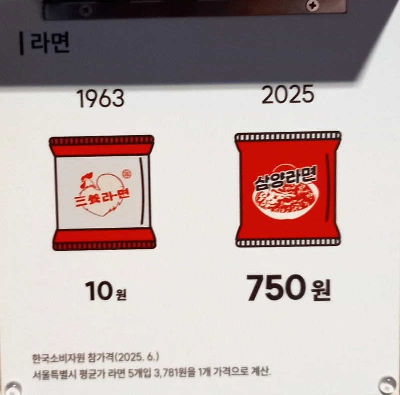 서울의 변천사에서는 질문을 열면 답이 나오는 구성으로 연출된 부분이 재미있었는데요. 가장 먼저 제 손을 움직인 질문은 “우리나라 최초의 라면은 얼마였을까”로, 지금 750원 정도인 동 제품의 라면이 60년도 더 전인 1963년에는 10원이었더라고요.