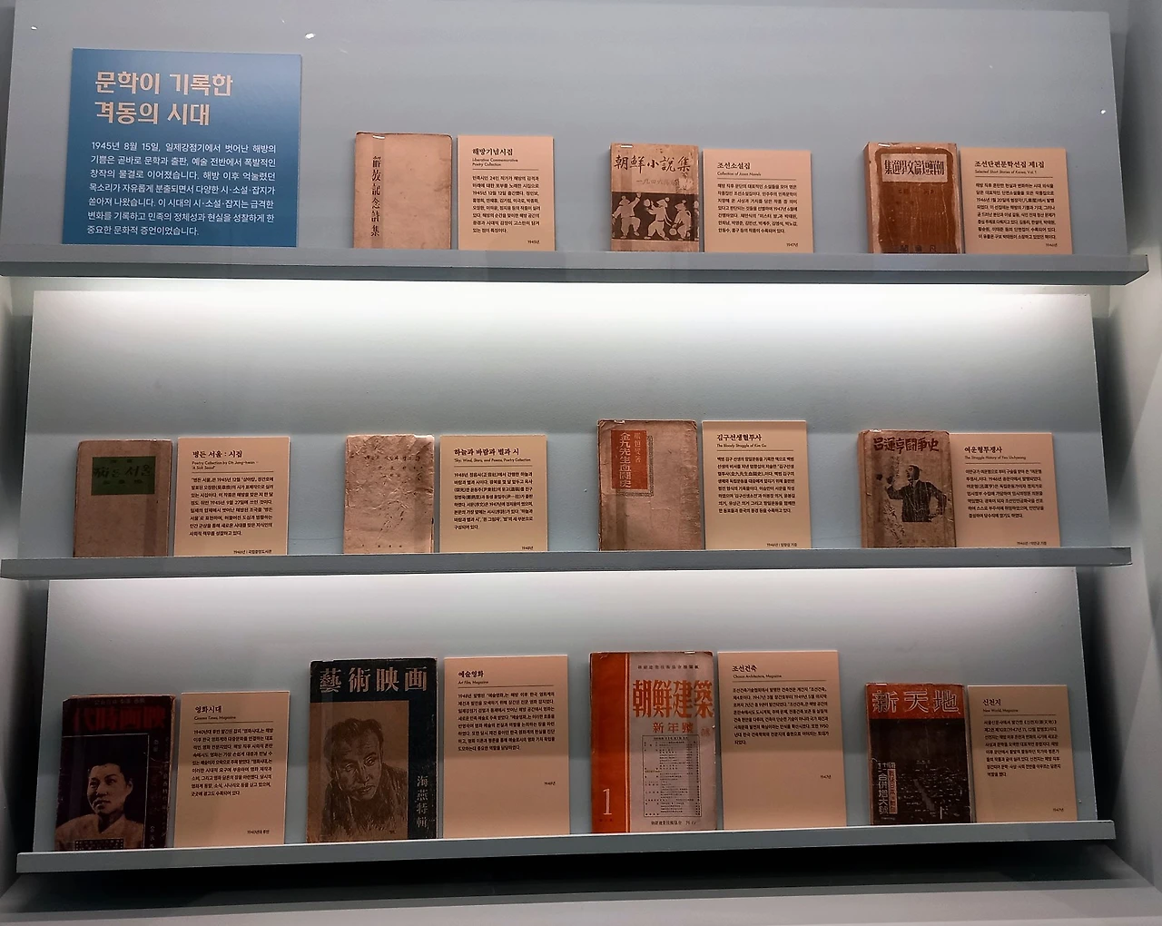 그 옆에는 당대의 작품이 전시돼 있었는데 ‘김구선생혈투사’, ‘여운형투쟁사’와 같은 독립투사들의 이야기, 조선소설집 등 소설 모음, 윤동주의 ‘하늘과 바람과 별과 시’ 등 시집, 영화 전문 잡지와 ‘조선건축’이라는 건축 전문 계간지까지 당대의 다양한 분야의 작품들을 엿볼 수 있었습니다. 특히 이들 예술작품을 통해 광복 직후의 시대 모습을 알 수 있기에, 기록물로도 유의미한 작품입니다.