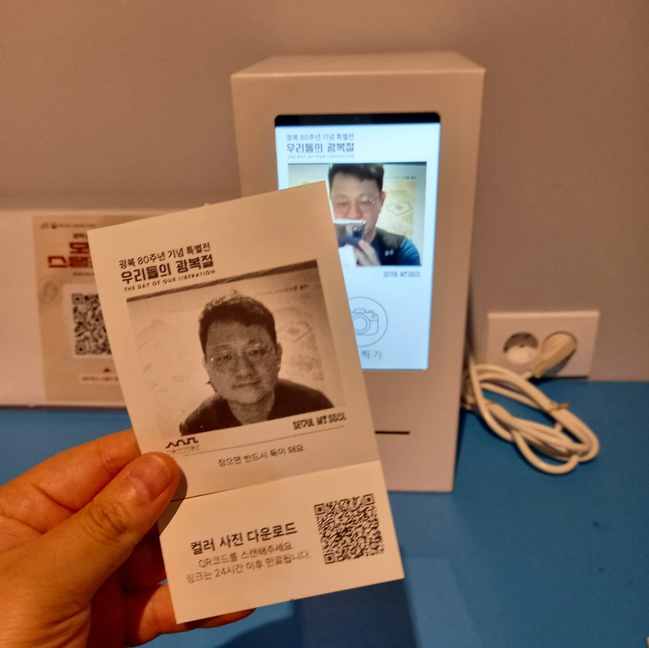 엽서 그리기 책상 우측에는 “영수증 사진기” 박스가 있었고 사진 찍기 버튼을 누르면 바로 흑백으로 셀카 사진이 아래의 컬러 사진 다운로드 큐알코드와 함께 나옵니다. 이 큐알 코드를 접속하면 컬러 사진으로 다운로드가 가능하고요. 다른 건 어린이들에게 양보해도 사진 찍는 건 간단했기에 저도 한 번 해봤습니다. 종이 인쇄에 이어 컬러 파일 다운로드까지. 참 기술과 아이디어가 좋아졌다는 생각을 하게 된 사진 찍기였습니다.