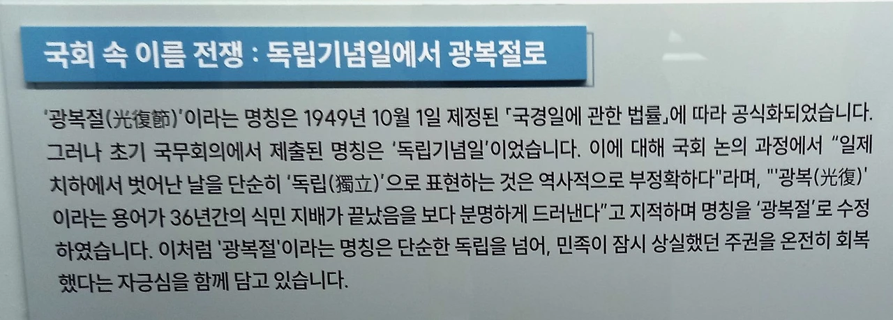 처음에 해방일, 해방기념일이라고 했던 점은 흥미로웠습니다. 왜 “광복절”이라고 불렀는지에 대해 딱 한 두 번 정도 생각한 적이 있었습니다만, 이내 그 생각을 접고 더는 나아가지 않았었는데요. 알고 보니 법률로 정해서였네요. 그것도 독립기념일과의 명칭 논쟁 끝에 광복절이라고 명명된. 단순히 독립으로 표현하는 것을 넘어 주권을 온전히 회복했다는 자긍심을 담은 “광복”으로 지은 것, 그 마음 잘 새기겠습니다.